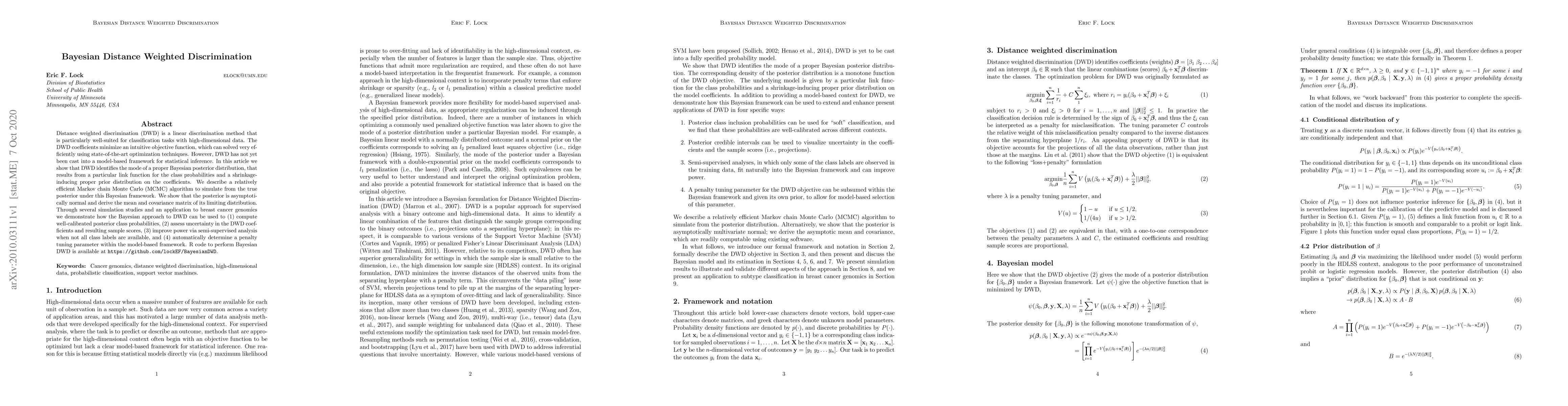 This paper introduces a Bayesian framework for distance weighted discrimination (DWD), showing it identifies the mode of a Bayesian posterior distribution. An efficient MCMC algorithm is used to simulate from this posterior, demonstrating its asymptotic normality and providing means for calibrated posterior class probabilities, uncertainty assessment, semi-supervised analysis, and automatic penalty tuning.