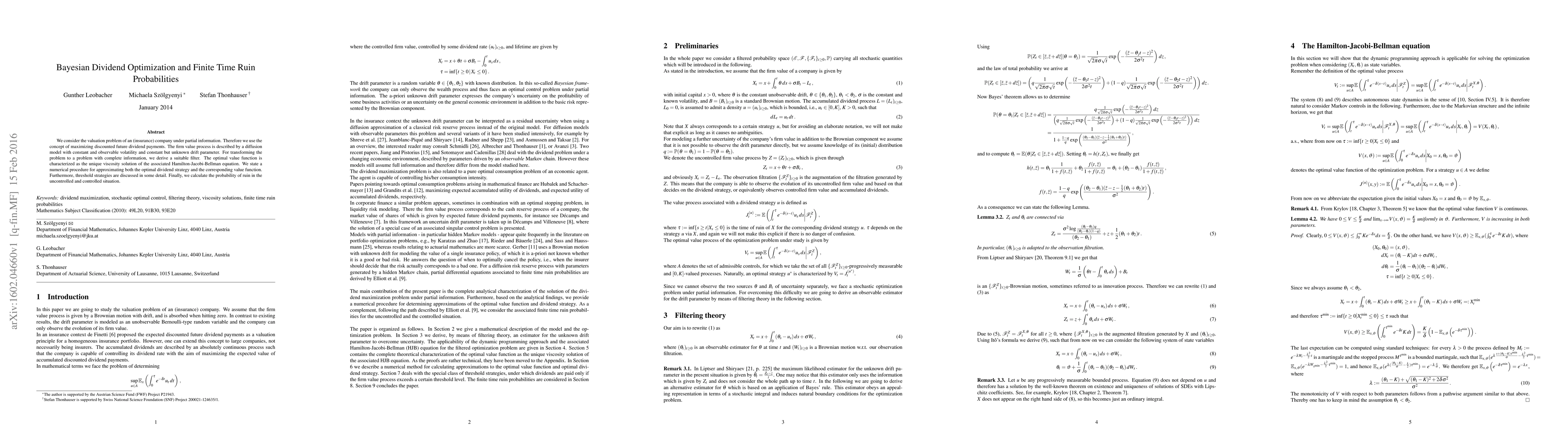 We consider the valuation problem of an (insurance) company under partial information. Therefore we use the concept of maximizing discounted future dividend payments. The firm value process is described by a diffusion model with constant and observable volatility and constant but unknown drift parameter. For transforming the problem to a problem with complete information, we derive a suitable filter. The optimal value function is characterized as the unique viscosity solution of the associated Hamilton-Jacobi-Bellman equation. We state a numerical procedure for approximating both the optimal dividend strategy and the corresponding value function. Furthermore, threshold strategies are discussed in some detail. Finally, we calculate the probability of ruin in the uncontrolled and controlled situation.