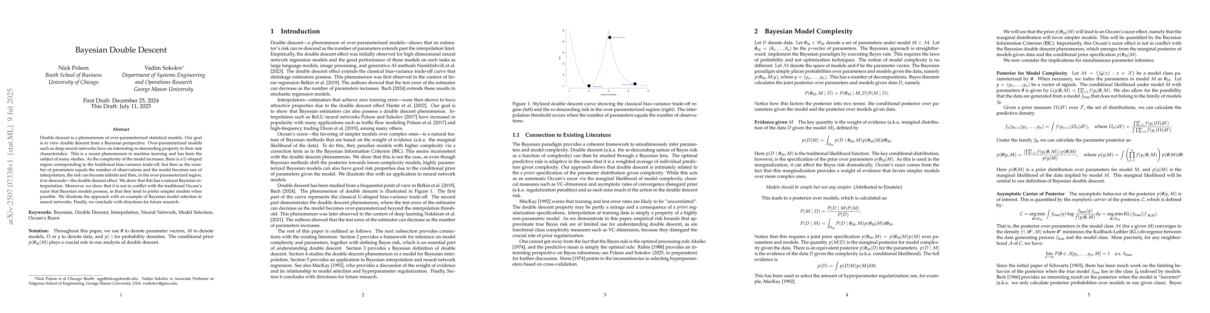 Double descent is a phenomenon of over-parameterized statistical models. Our goal is to view double descent from a Bayesian perspective. Over-parameterized models such as deep neural networks have an interesting re-descending property in their risk characteristics. This is a recent phenomenon in machine learning and has been the subject of many studies. As the complexity of the model increases, there is a U-shaped region corresponding to the traditional bias-variance trade-off, but then as the number of parameters equals the number of observations and the model becomes one of interpolation, the risk can become infinite and then, in the over-parameterized region, it re-descends -- the double descent effect. We show that this has a natural Bayesian interpretation. Moreover, we show that it is not in conflict with the traditional Occam's razor that Bayesian models possess, in that they tend to prefer simpler models when possible. We illustrate the approach with an example of Bayesian model selection in neural networks. Finally, we conclude with directions for future research.