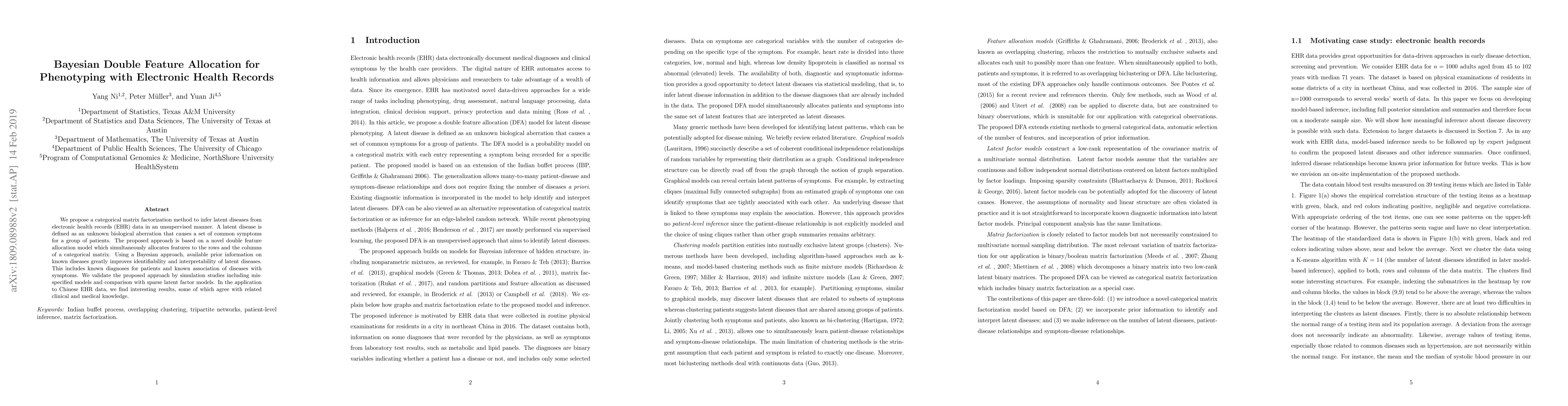 We propose a categorical matrix factorization method to infer latent diseases from electronic health records (EHR) data in an unsupervised manner. A latent disease is defined as an unknown biological aberration that causes a set of common symptoms for a group of patients. The proposed approach is based on a novel double feature allocation model which simultaneously allocates features to the rows and the columns of a categorical matrix. Using a Bayesian approach, available prior information on known diseases greatly improves identifiability and interpretability of latent diseases. This includes known diagnoses for patients and known association of diseases with symptoms. We validate the proposed approach by simulation studies including mis-specified models and comparison with sparse latent factor models. In the application to Chinese EHR data, we find interesting results, some of which agree with related clinical and medical knowledge.