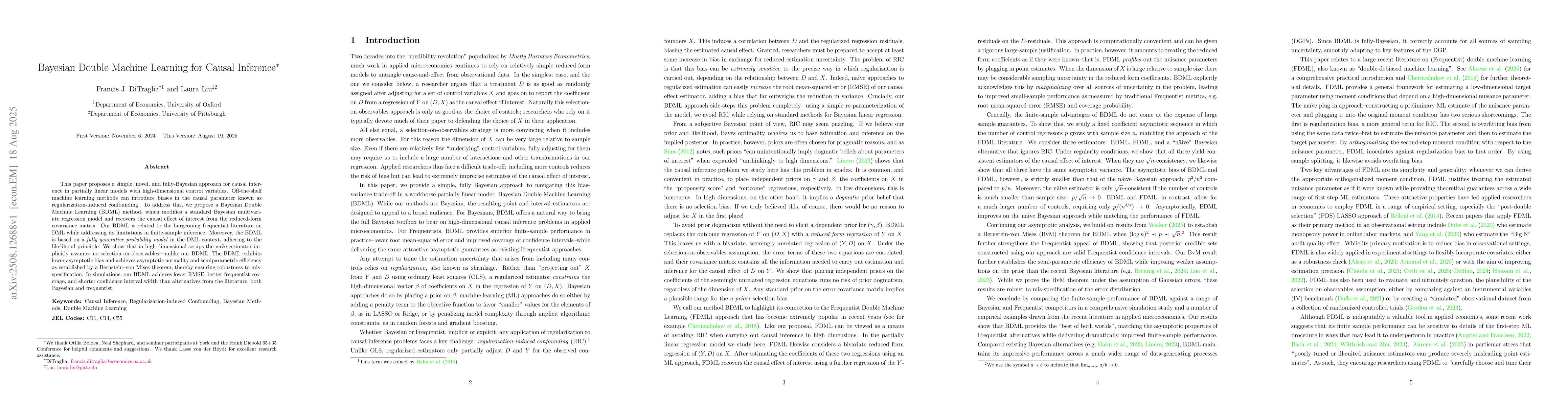 This paper proposes a simple, novel, and fully-Bayesian approach for causal inference in partially linear models with high-dimensional control variables. Off-the-shelf machine learning methods can introduce biases in the causal parameter known as regularization-induced confounding. To address this, we propose a Bayesian Double Machine Learning (BDML) method, which modifies a standard Bayesian multivariate regression model and recovers the causal effect of interest from the reduced-form covariance matrix. Our BDML is related to the burgeoning frequentist literature on DML while addressing its limitations in finite-sample inference. Moreover, the BDML is based on a fully generative probability model in the DML context, adhering to the likelihood principle. We show that in high dimensional setups the naive estimator implicitly assumes no selection on observables--unlike our BDML. The BDML exhibits lower asymptotic bias and achieves asymptotic normality and semiparametric efficiency as established by a Bernstein-von Mises theorem, thereby ensuring robustness to misspecification. In simulations, our BDML achieves lower RMSE, better frequentist coverage, and shorter confidence interval width than alternatives from the literature, both Bayesian and frequentist.