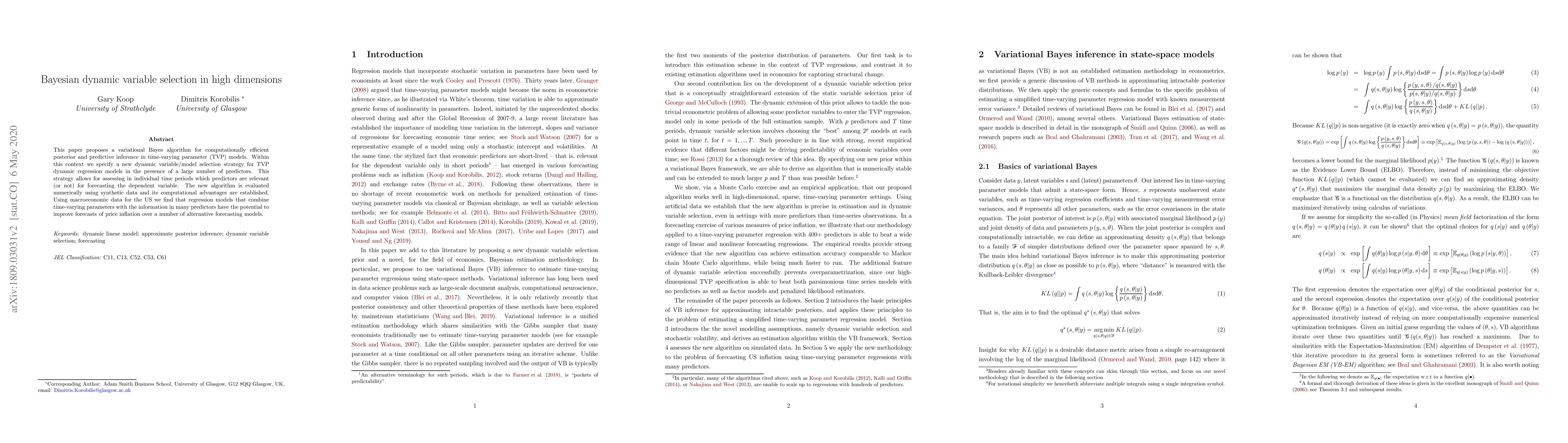 This paper proposes a variational Bayes algorithm for computationally efficient posterior and predictive inference in time-varying parameter (TVP) models. Within this context we specify a new dynamic variable/model selection strategy for TVP dynamic regression models in the presence of a large number of predictors. This strategy allows for assessing in individual time periods which predictors are relevant (or not) for forecasting the dependent variable. The new algorithm is evaluated numerically using synthetic data and its computational advantages are established. Using macroeconomic data for the US we find that regression models that combine time-varying parameters with the information in many predictors have the potential to improve forecasts of price inflation over a number of alternative forecasting models.