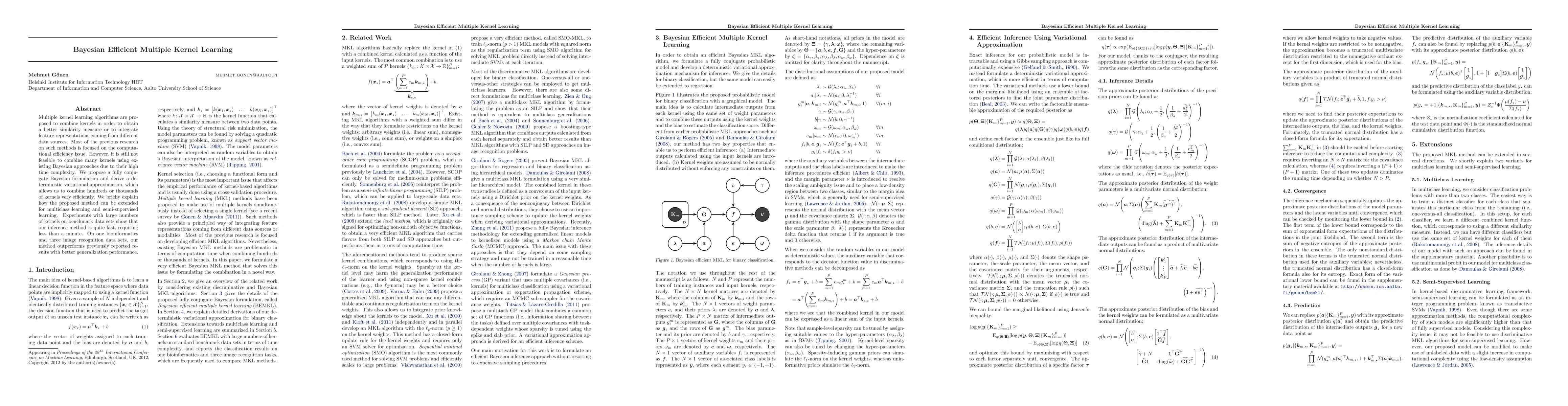 Multiple kernel learning algorithms are proposed to combine kernels in order to obtain a better similarity measure or to integrate feature representations coming from different data sources. Most of the previous research on such methods is focused on the computational efficiency issue. However, it is still not feasible to combine many kernels using existing Bayesian approaches due to their high time complexity. We propose a fully conjugate Bayesian formulation and derive a deterministic variational approximation, which allows us to combine hundreds or thousands of kernels very efficiently. We briefly explain how the proposed method can be extended for multiclass learning and semi-supervised learning. Experiments with large numbers of kernels on benchmark data sets show that our inference method is quite fast, requiring less than a minute. On one bioinformatics and three image recognition data sets, our method outperforms previously reported results with better generalization performance.
