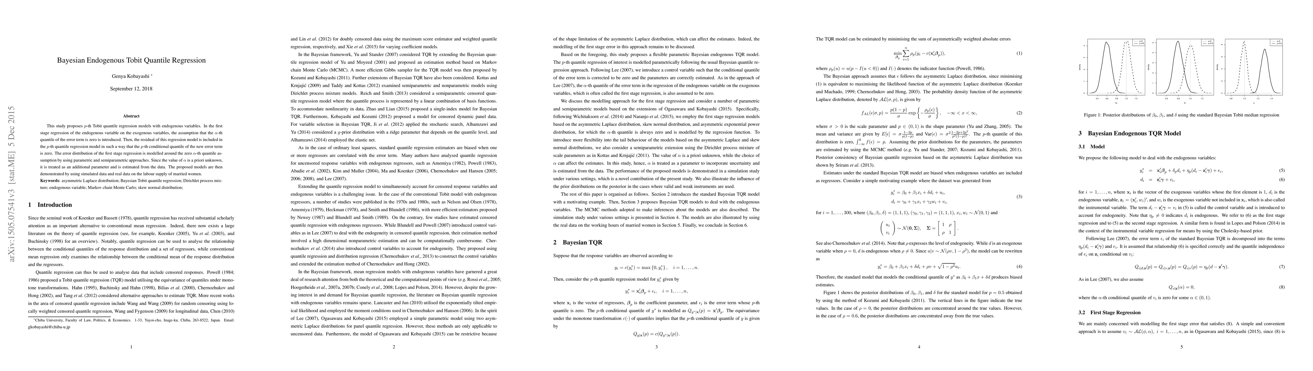 This study introduces Bayesian Tobit quantile regression models for endogenous variables, assuming zero $\alpha$-th quantile of the error term in the first stage. It estimates the unknown $\alpha$ and demonstrates the model using simulated and real labour supply data.