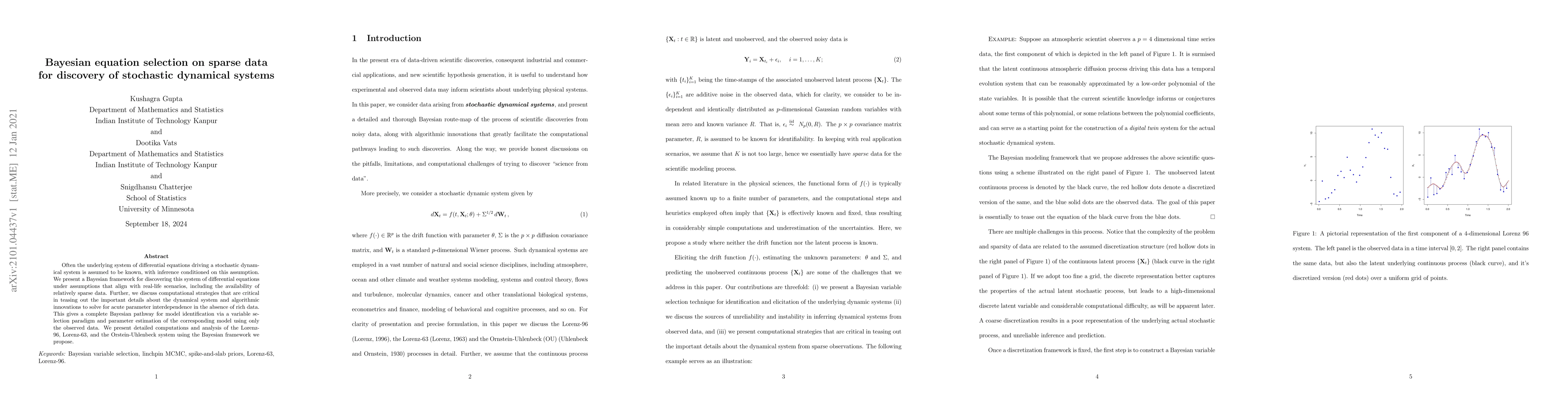 Often the underlying system of differential equations driving a stochastic dynamical system is assumed to be known, with inference conditioned on this assumption. We present a Bayesian framework for discovering this system of differential equations under assumptions that align with real-life scenarios, including the availability of relatively sparse data. Further, we discuss computational strategies that are critical in teasing out the important details about the dynamical system and algorithmic innovations to solve for acute parameter interdependence in the absence of rich data. This gives a complete Bayesian pathway for model identification via a variable selection paradigm and parameter estimation of the corresponding model using only the observed data. We present detailed computations and analysis of the Lorenz-96, Lorenz-63, and the Orstein-Uhlenbeck system using the Bayesian framework we propose.