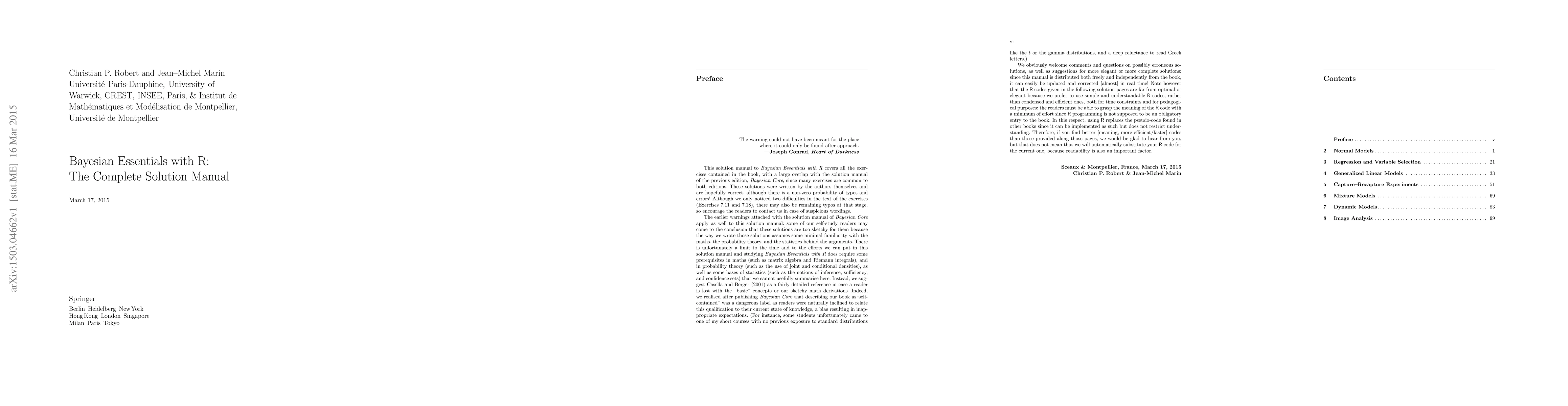 This book provides comprehensive solutions for all exercises in "Bayesian Essentials with R," a 2014 textbook that teaches Bayesian analysis using R programming. It serves as an invaluable guide for students and practitioners tackling Bayesian methods in R.