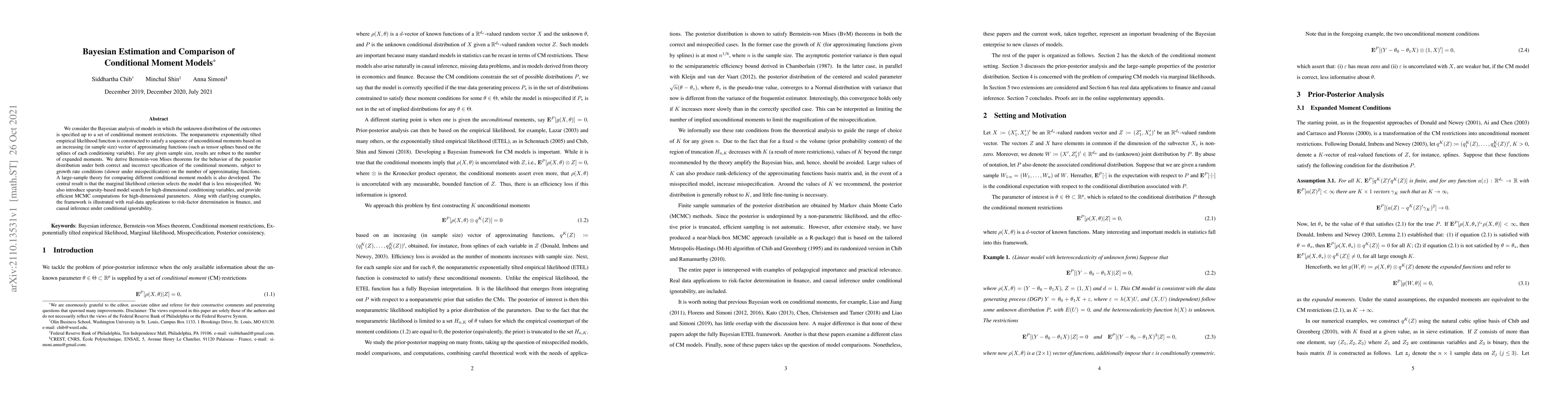 This paper develops a Bayesian framework for estimating and comparing conditional moment models, which can handle high-dimensional conditioning variables. It finds that the marginal likelihood criterion selects the less misspecified model, providing a robust method for risk-factor determination and causal inference.