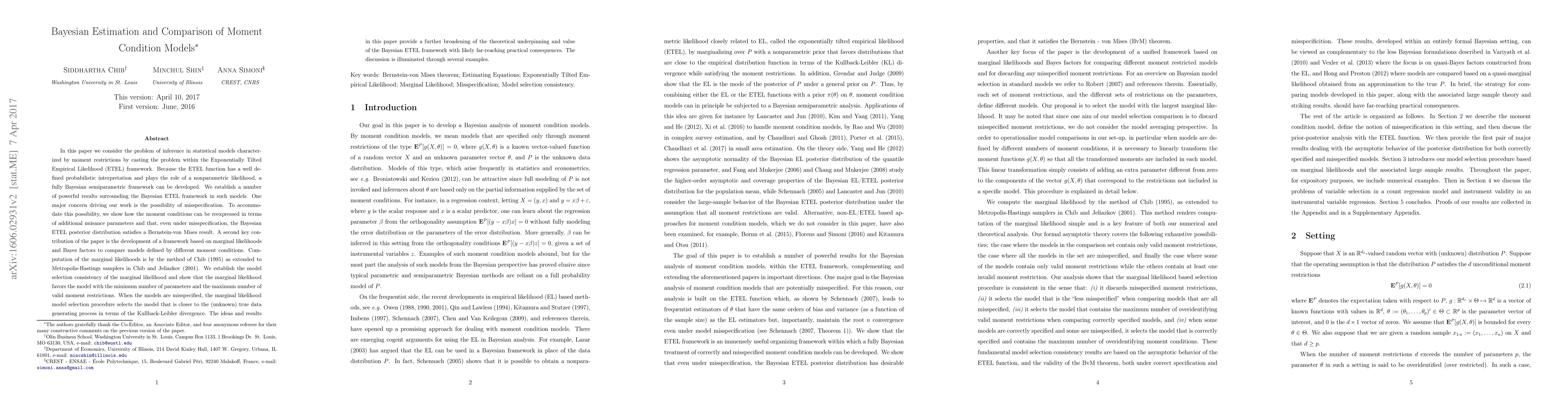 In this paper we consider the problem of inference in statistical models characterized by moment restrictions by casting the problem within the Exponentially Tilted Empirical Likelihood (ETEL) framework. Because the ETEL function has a well defined probabilistic interpretation and plays the role of a nonparametric likelihood, a fully Bayesian semiparametric framework can be developed. We establish a number of powerful results surrounding the Bayesian ETEL framework in such models. One major concern driving our work is the possibility of misspecification. To accommodate this possibility, we show how the moment conditions can be reexpressed in terms of additional nuisance parameters and that, even under misspecification, the Bayesian ETEL posterior distribution satisfies a Bernstein-von Mises result. A second key contribution of the paper is the development of a framework based on marginal likelihoods and Bayes factors to compare models defined by different moment conditions. Computation of the marginal likelihoods is by the method of Chib (1995) as extended to Metropolis-Hastings samplers in Chib and Jeliazkov (2001). We establish the model selection consistency of the marginal likelihood and show that the marginal likelihood favors the model with the minimum number of parameters and the maximum number of valid moment restrictions. When the models are misspecified, the marginal likelihood model selection procedure selects the model that is closer to the (unknown) true data generating process in terms of the Kullback-Leibler divergence. The ideas and results in this paper provide a further broadening of the theoretical underpinning and value of the Bayesian ETEL framework with likely far-reaching practical consequences. The discussion is illuminated through several examples.