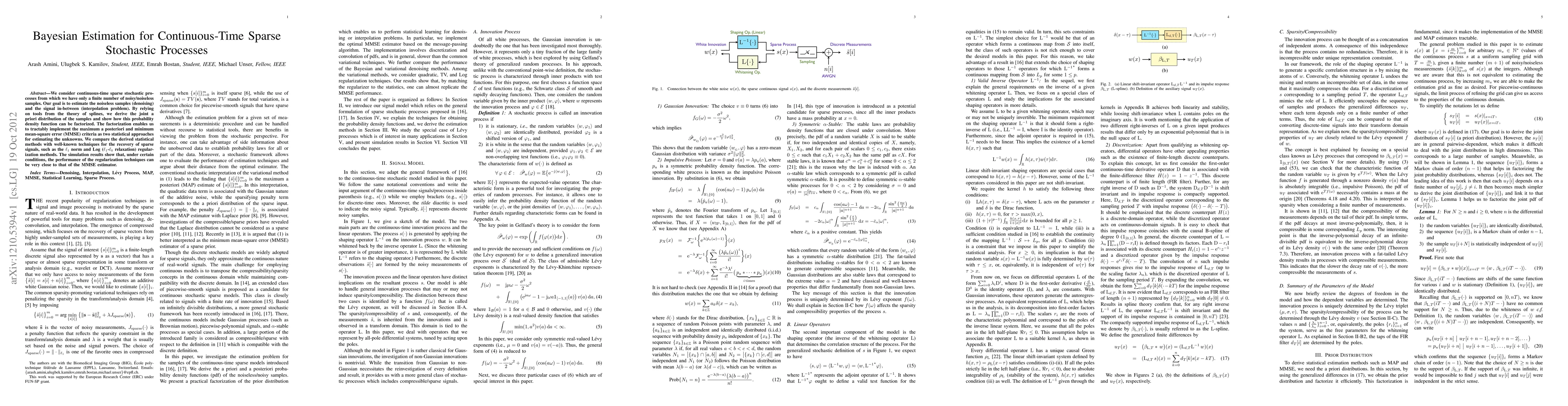 This paper proposes Bayesian estimation methods for continuous-time sparse stochastic processes using spline theory to factorize the joint a priori distribution. It implements maximum a posteriori and minimum mean-square error criteria for denoising and interpolation, comparing their performance to $\ell_1$ norm and Log ($\ell_1$-$\ell_0$) regularization techniques.