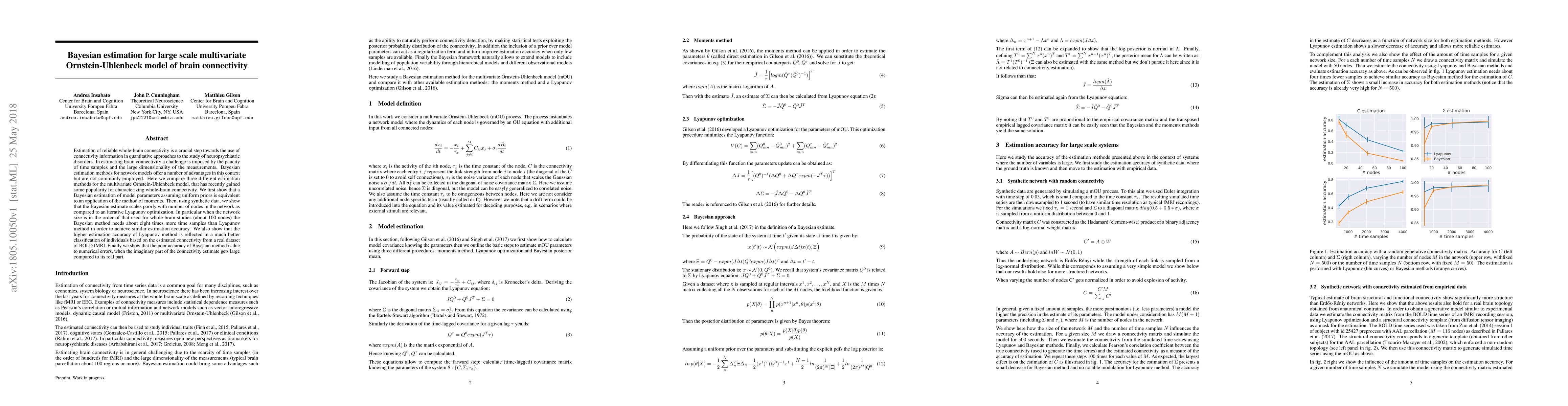 This paper compares Bayesian estimation methods with iterative Lyapunov optimization for estimating parameters in a large-scale multivariate Ornstein-Uhlenbeck model of brain connectivity. The Bayesian method scales poorly with network size, requiring significantly more time samples for similar accuracy compared to the Lyapunov method, which also shows better performance in classifying individuals based on fMRI data.