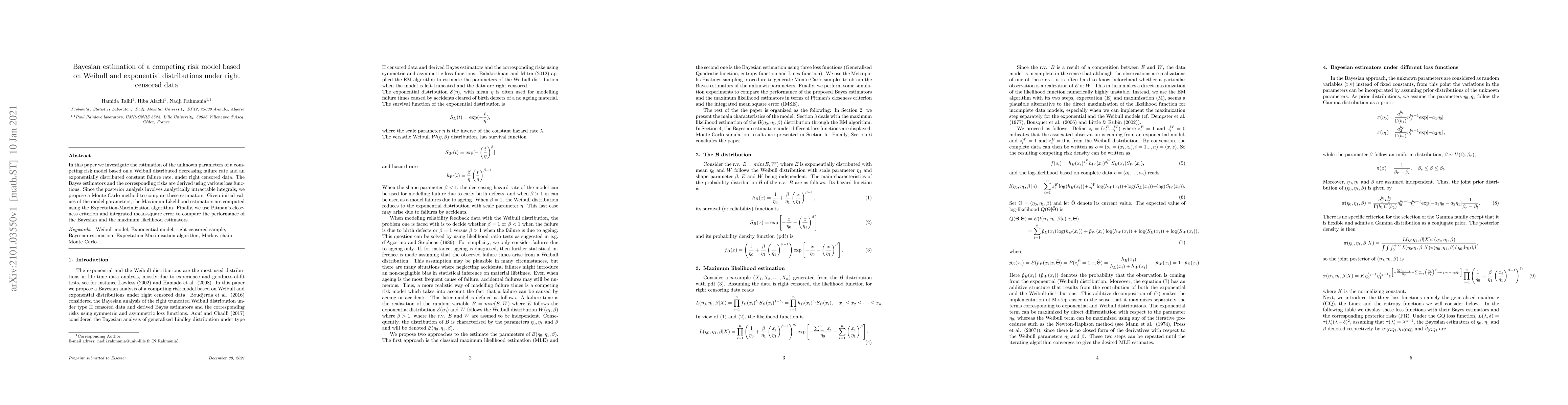 Summary: This paper presents Bayesian estimation techniques for a competing risk model using Weibull and exponential distributions under right censored data. It focuses on likelihood estimators to determine the unknown parameters of the model.