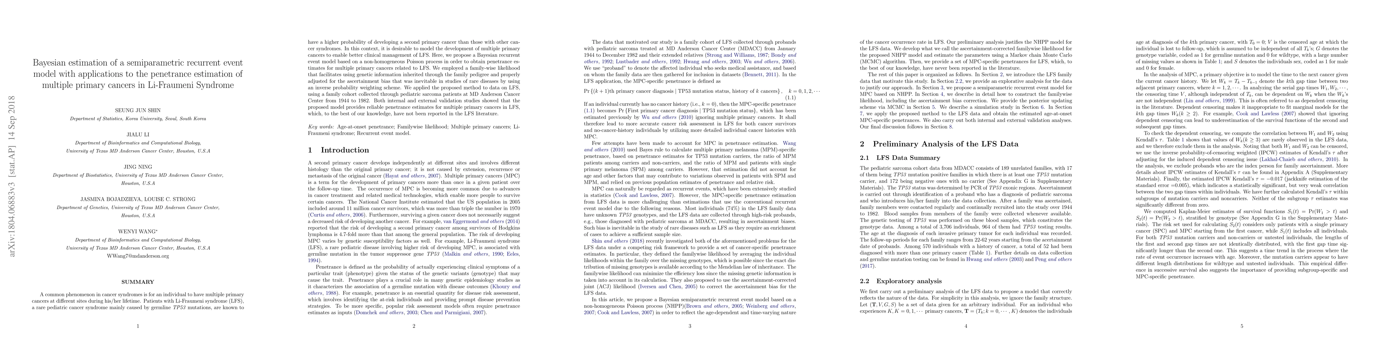 This paper proposes a Bayesian recurrent event model to estimate penetrance for multiple primary cancers in Li-Fraumeni Syndrome, leveraging genetic information and adjusting for ascertainment bias. The model's effectiveness is validated through internal and external studies using data from pediatric sarcoma patients.