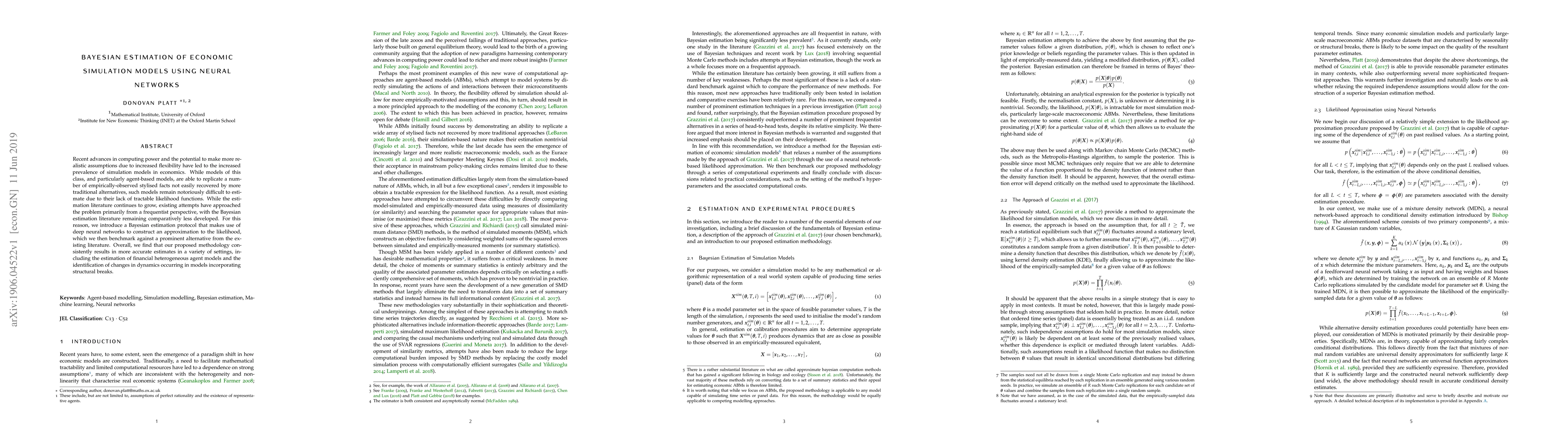 Recent advances in computing power and the potential to make more realistic assumptions due to increased flexibility have led to the increased prevalence of simulation models in economics. While models of this class, and particularly agent-based models, are able to replicate a number of empirically-observed stylised facts not easily recovered by more traditional alternatives, such models remain notoriously difficult to estimate due to their lack of tractable likelihood functions. While the estimation literature continues to grow, existing attempts have approached the problem primarily from a frequentist perspective, with the Bayesian estimation literature remaining comparatively less developed. For this reason, we introduce a Bayesian estimation protocol that makes use of deep neural networks to construct an approximation to the likelihood, which we then benchmark against a prominent alternative from the existing literature. Overall, we find that our proposed methodology consistently results in more accurate estimates in a variety of settings, including the estimation of financial heterogeneous agent models and the identification of changes in dynamics occurring in models incorporating structural breaks.