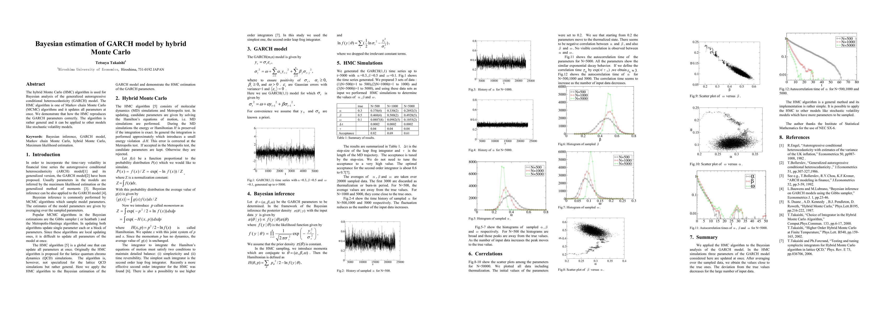 This paper uses the hybrid Monte Carlo (HMC) algorithm for Bayesian estimation of the GARCH model, showing that HMC effectively updates all parameters simultaneously and accurately reproduces GARCH parameters. The method is also noted for its general applicability to other models, such as stochastic volatility models.