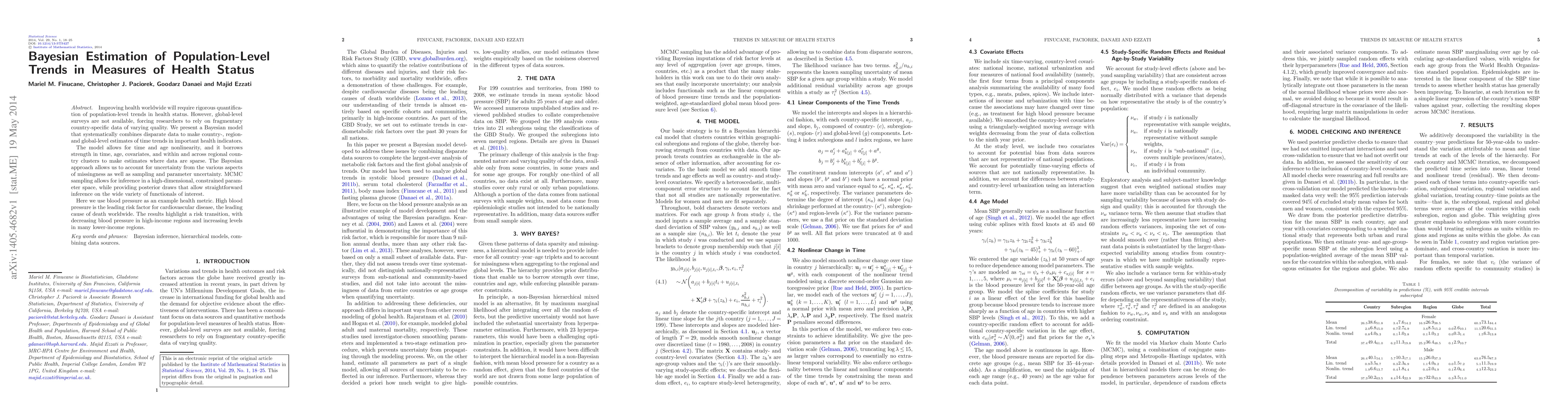Improving health worldwide will require rigorous quantification of population-level trends in health status. However, global-level surveys are not available, forcing researchers to rely on fragmentary country-specific data of varying quality. We present a Bayesian model that systematically combines disparate data to make country-, region- and global-level estimates of time trends in important health indicators. The model allows for time and age nonlinearity, and it borrows strength in time, age, covariates, and within and across regional country clusters to make estimates where data are sparse. The Bayesian approach allows us to account for uncertainty from the various aspects of missingness as well as sampling and parameter uncertainty. MCMC sampling allows for inference in a high-dimensional, constrained parameter space, while providing posterior draws that allow straightforward inference on the wide variety of functionals of interest. Here we use blood pressure as an example health metric. High blood pressure is the leading risk factor for cardiovascular disease, the leading cause of death worldwide. The results highlight a risk transition, with decreasing blood pressure in high-income regions and increasing levels in many lower-income regions.
