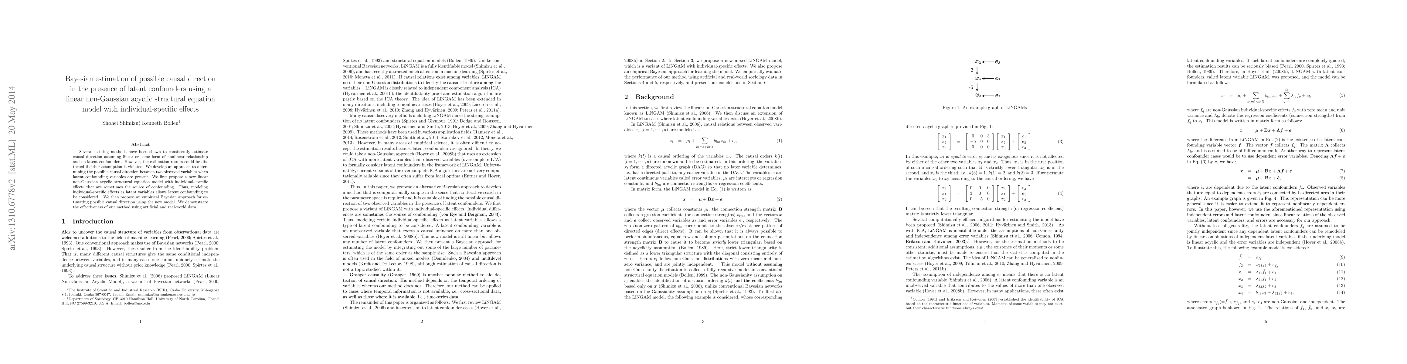 This paper proposes a new linear non-Gaussian acyclic structural equation model with individual-specific effects to estimate causal direction between two variables in the presence of latent confounders. An empirical Bayesian approach is introduced to estimate possible causal direction, demonstrating effectiveness through both artificial and real-world data.