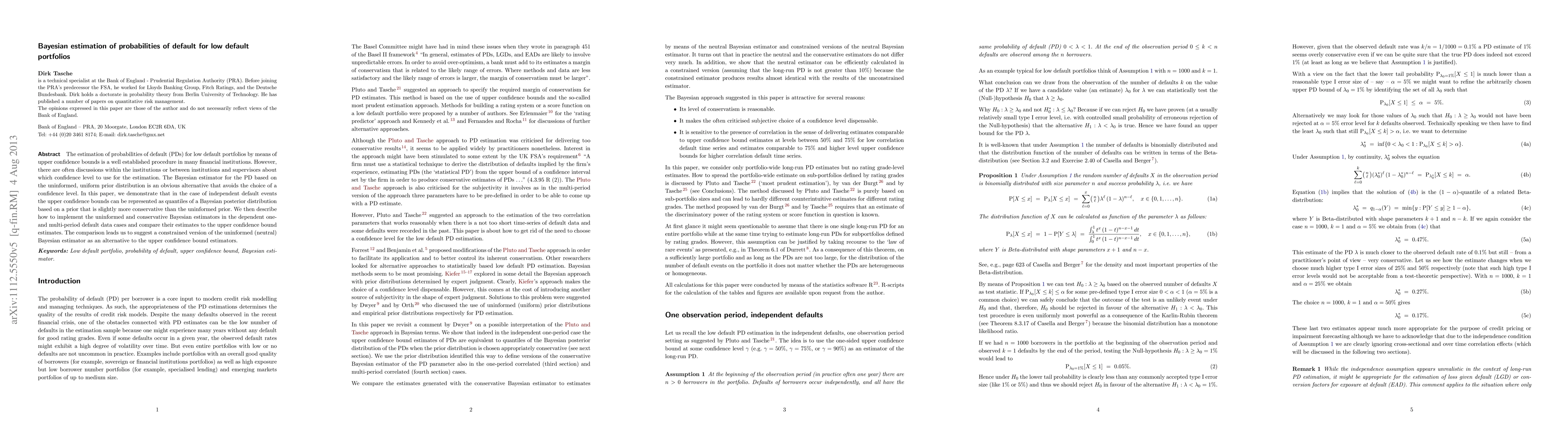 This paper explores Bayesian estimators for probabilities of default (PDs) in low default portfolios, demonstrating that upper confidence bounds can be represented as quantiles of a Bayesian posterior distribution. It suggests a constrained version of the uninformed Bayesian estimator as an alternative to traditional upper confidence bound estimators.