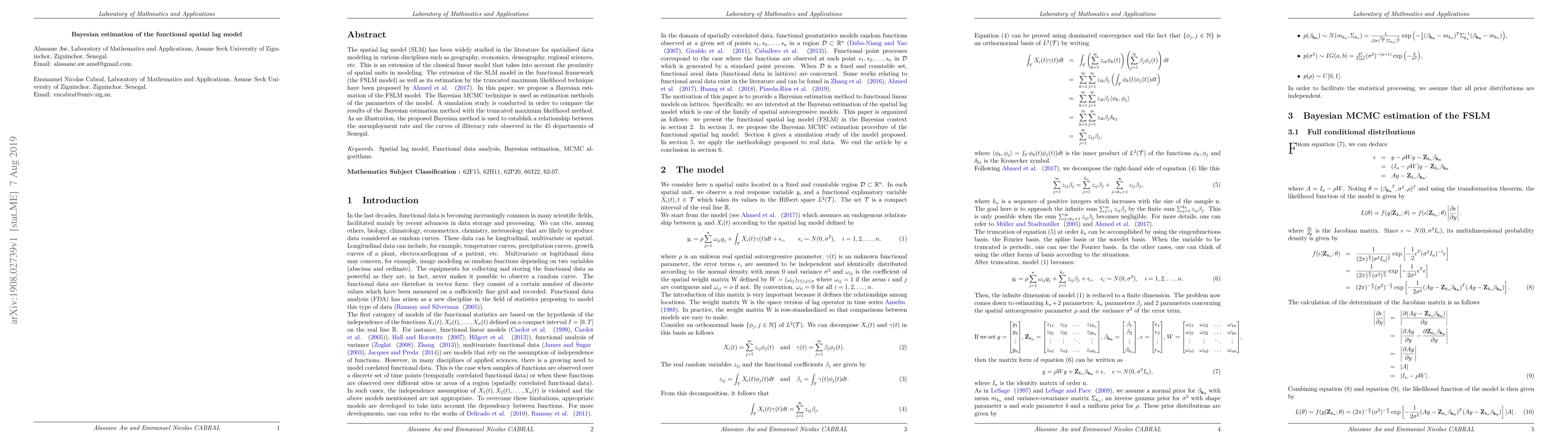 This paper proposes a Bayesian estimation method for the functional spatial lag model (FSLM) using MCMC techniques, comparing it to truncated maximum likelihood. An application to Senegalese unemployment and illiteracy rate data demonstrates the method's effectiveness.