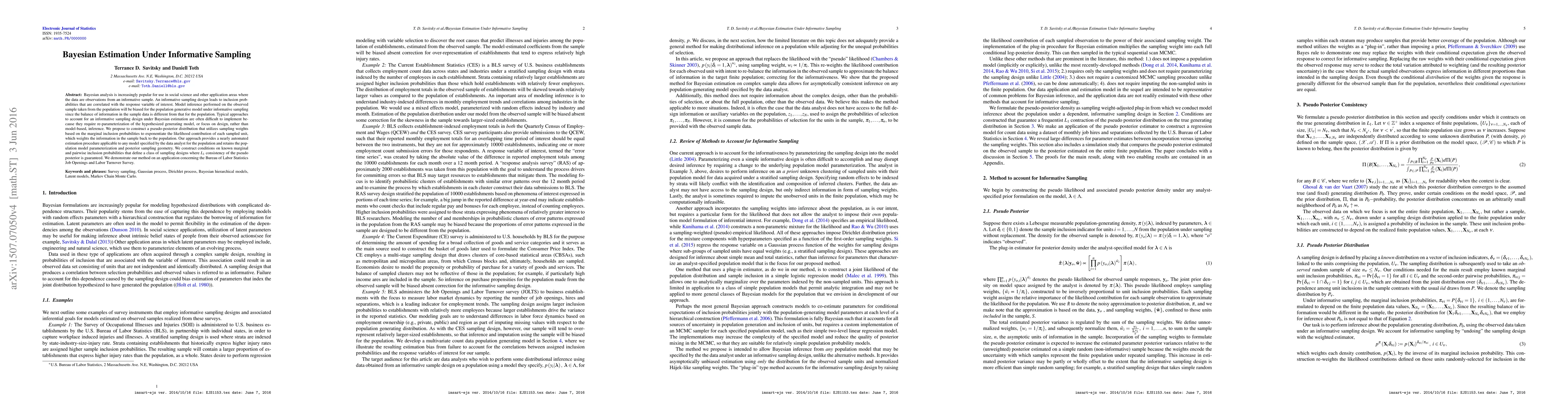 Bayesian analysis is increasingly popular for use in social science and other application areas where the data are observations from an informative sample. An informative sampling design leads to inclusion probabilities that are correlated with the response variable of interest. Model inference performed on the observed sample taken from the population will be biased for the population generative model under informative sampling since the balance of information in the sample data is different from that for the population. Typical approaches to account for an informative sampling design under Bayesian estimation are often difficult to implement because they require re-parameterization of the hypothesized generating model, or focus on design, rather than model-based, inference. We propose to construct a pseudo-posterior distribution that utilizes sampling weights based on the marginal inclusion probabilities to exponentiate the likelihood contribution of each sampled unit, which weights the information in the sample back to the population. Our approach provides a nearly automated estimation procedure applicable to any model specified by the data analyst for the population and retains the population model parameterization and posterior sampling geometry. We construct conditions on known marginal and pairwise inclusion probabilities that define a class of sampling designs where $L_{1}$ consistency of the pseudo posterior is guaranteed. We demonstrate our method on an application concerning the Bureau of Labor Statistics Job Openings and Labor Turnover Survey.