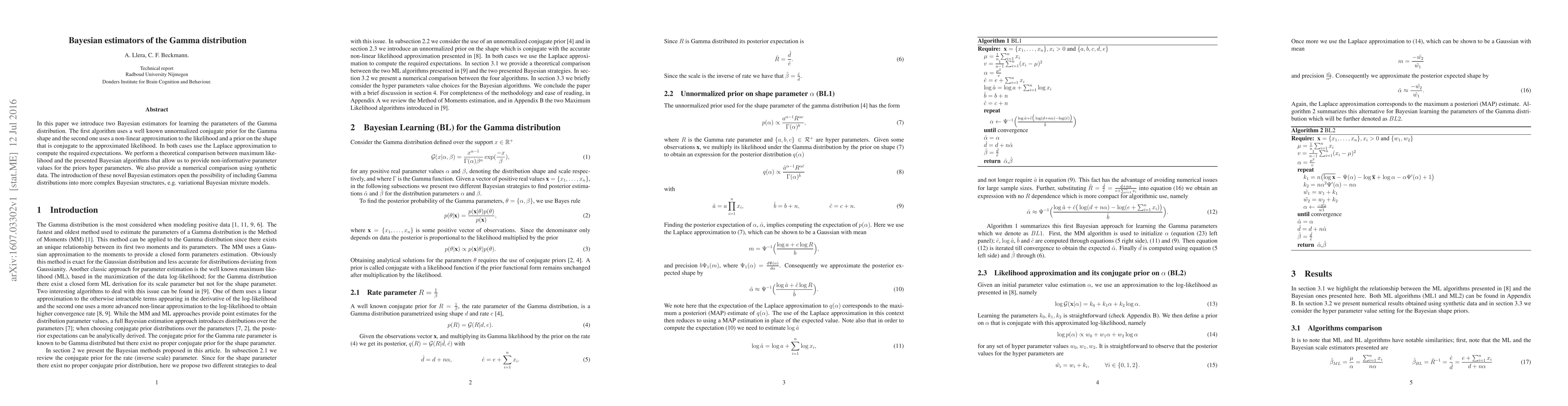 In this paper we introduce two Bayesian estimators for learning the parameters of the Gamma distribution. The first algorithm uses a well known unnormalized conjugate prior for the Gamma shape and the second one uses a non-linear approximation to the likelihood and a prior on the shape that is conjugate to the approximated likelihood. In both cases use the Laplace approximation to compute the required expectations. We perform a theoretical comparison between maximum like- lihood and the presented Bayesian algorithms that allow us to provide non-informative parameter values for the priors hyper parameters. We also provide a numerical comparison using synthetic data. The introduction of these novel Bayesian estimators open the possibility of including Gamma distributions into more complex Bayesian structures, e.g. variational Bayesian mixture models.