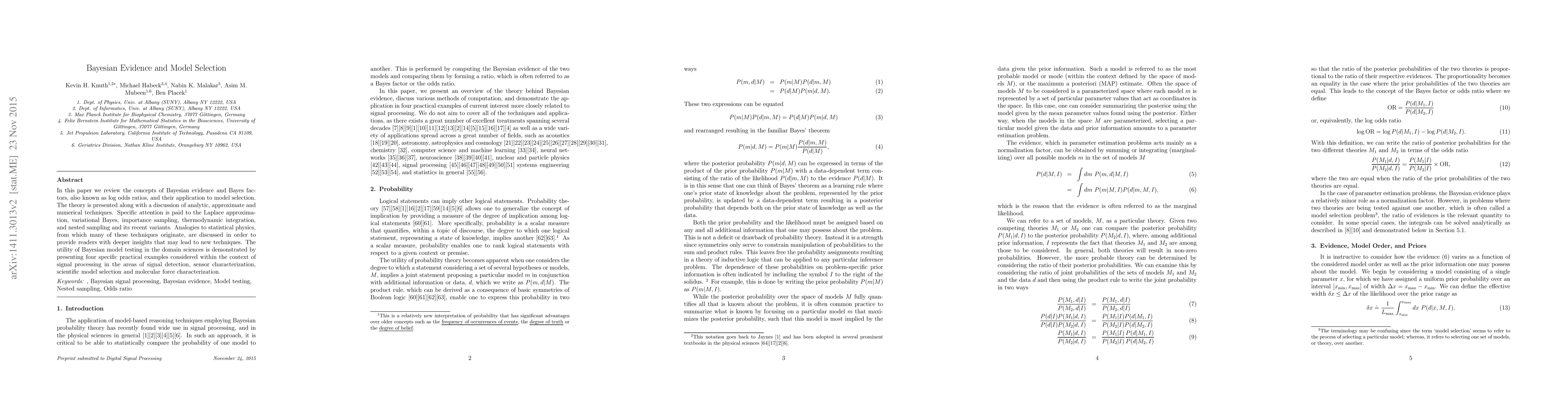 This paper reviews Bayesian evidence and model selection techniques, including analogies to statistical physics, to demonstrate their utility in scientific domains like signal processing. It presents four practical examples showcasing the application of these methods to real-world problems.