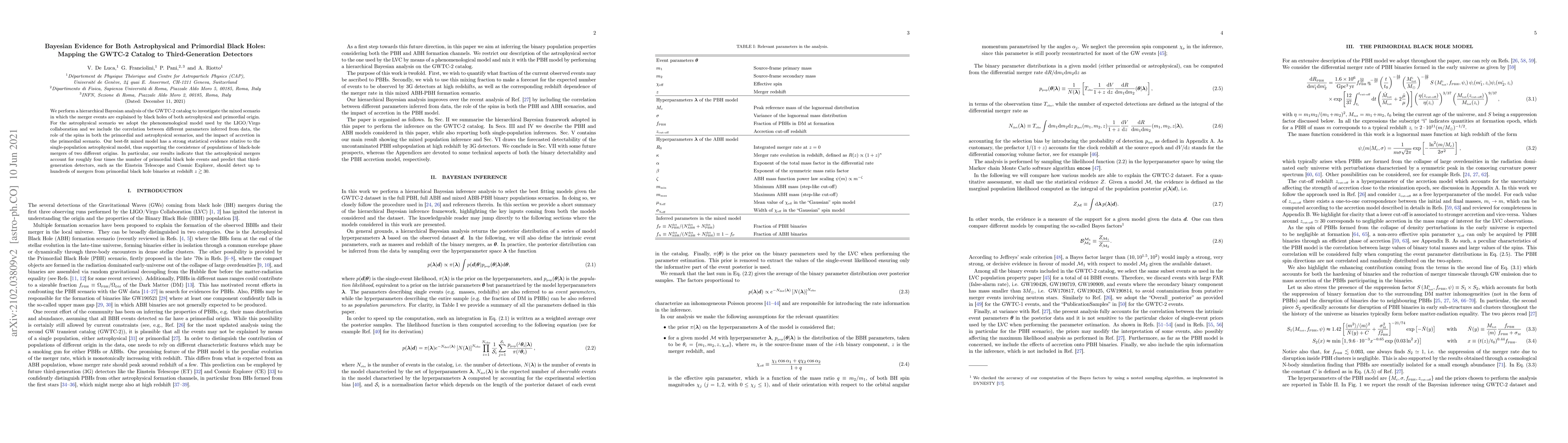 This paper uses a hierarchical Bayesian analysis of the GWTC-2 catalog to explore black hole mergers from both astrophysical and primordial origins, finding strong evidence for a mixed population. The results suggest that third-generation detectors will detect hundreds of mergers from primordial black hole binaries.