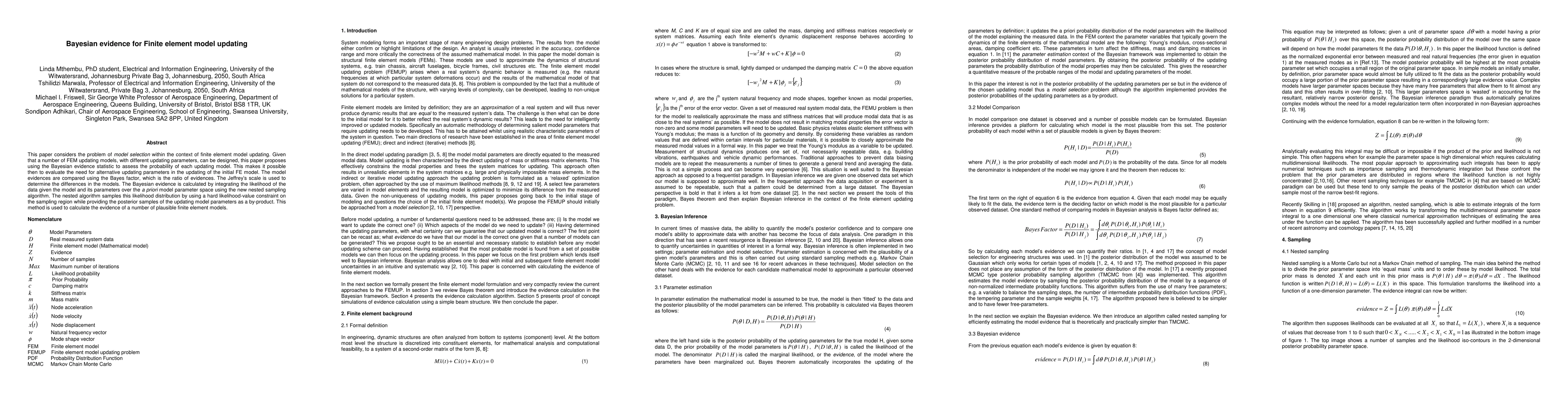 This paper proposes using Bayesian evidence and the Bayes factor to assess the probability of different finite element model updating parameters, employing a nested sampling algorithm to integrate the likelihood of data given the model and its parameters. The method evaluates the need for alternative updating parameters and determines model differences using the Jeffrey scale.