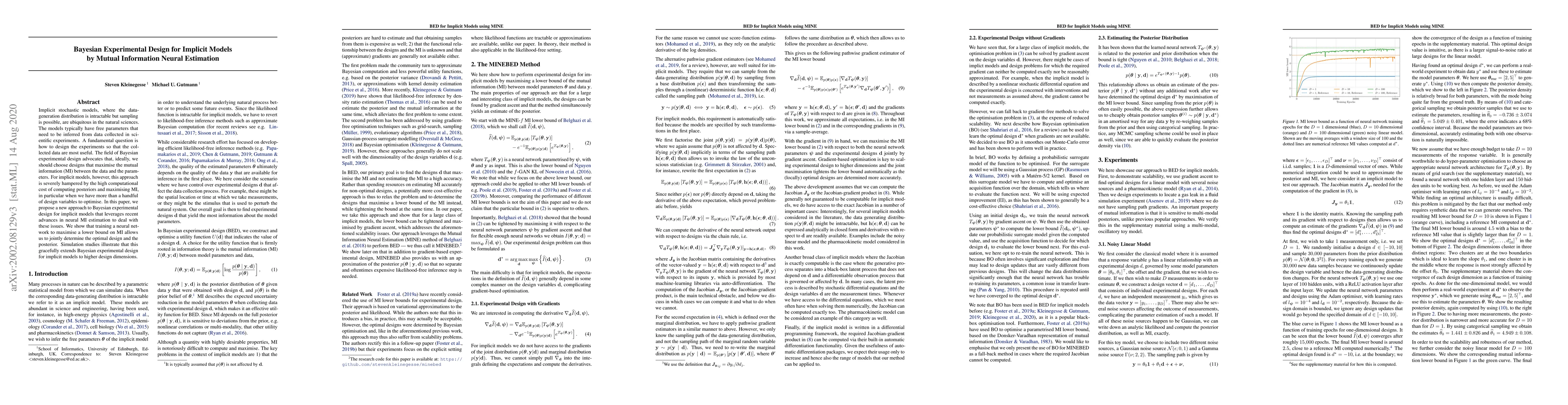 This paper proposes a novel Bayesian experimental design method for implicit stochastic models using neural mutual information estimation. By leveraging neural networks to maximize a lower bound on mutual information, the approach efficiently determines optimal experimental designs, extending the method to higher dimensions.