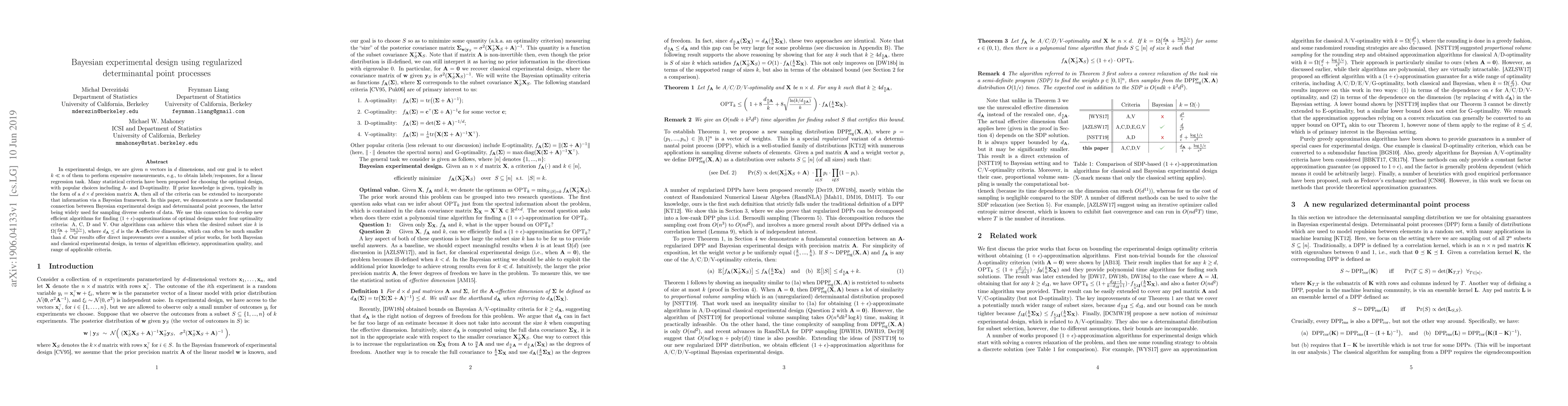 This paper introduces a novel Bayesian experimental design method using regularized determinantal point processes, establishing a connection between Bayesian criteria and determinantal point processes to develop efficient algorithms for approximating optimal designs under various criteria. The proposed algorithms achieve better efficiency and approximation quality compared to prior methods.