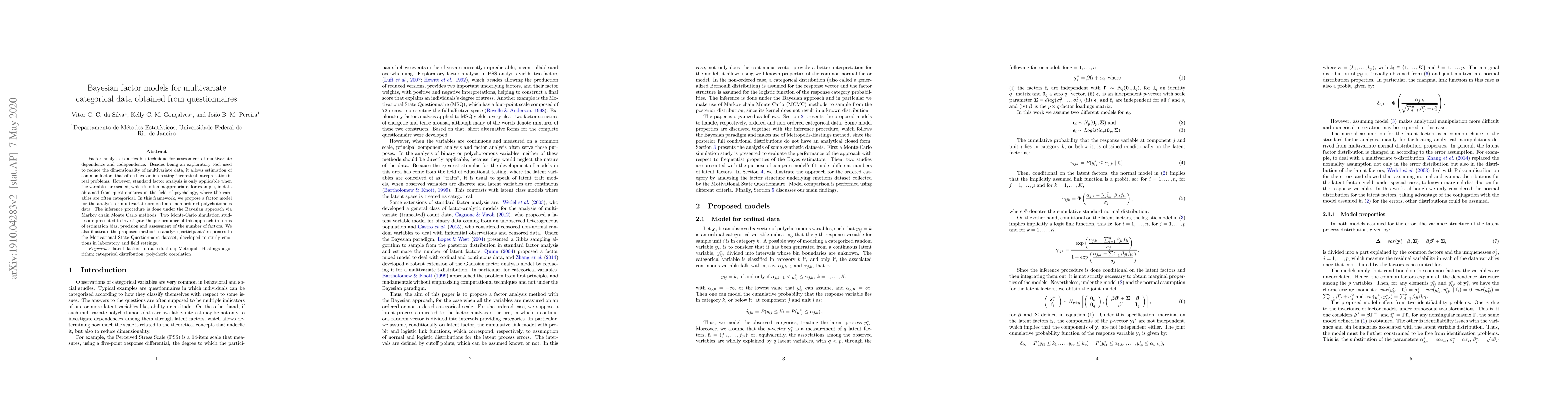This paper proposes a Bayesian factor model for analyzing multivariate categorical data from questionnaires, addressing the limitations of standard factor analysis. It employs Markov chain Monte Carlo methods for inference and evaluates the approach through simulation studies and an application to the Motivational State Questionnaire dataset.