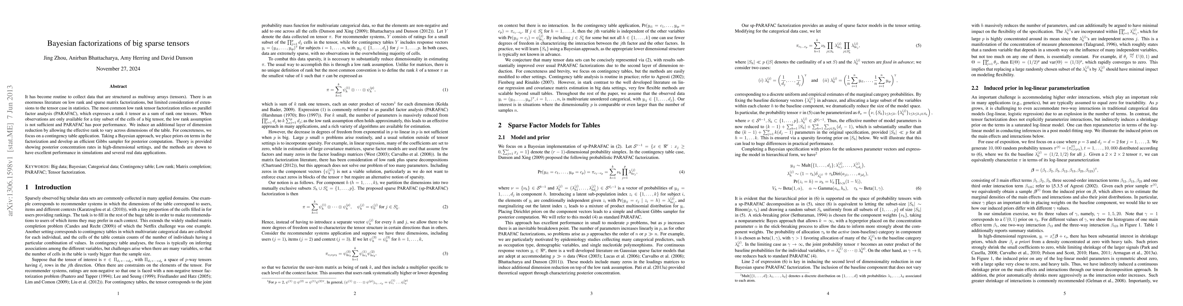 It has become routine to collect data that are structured as multiway arrays (tensors). There is an enormous literature on low rank and sparse matrix factorizations, but limited consideration of extensions to the tensor case in statistics. The most common low rank tensor factorization relies on parallel factor analysis (PARAFAC), which expresses a rank $k$ tensor as a sum of rank one tensors. When observations are only available for a tiny subset of the cells of a big tensor, the low rank assumption is not sufficient and PARAFAC has poor performance. We induce an additional layer of dimension reduction by allowing the effective rank to vary across dimensions of the table. For concreteness, we focus on a contingency table application. Taking a Bayesian approach, we place priors on terms in the factorization and develop an efficient Gibbs sampler for posterior computation. Theory is provided showing posterior concentration rates in high-dimensional settings, and the methods are shown to have excellent performance in simulations and several real data applications.