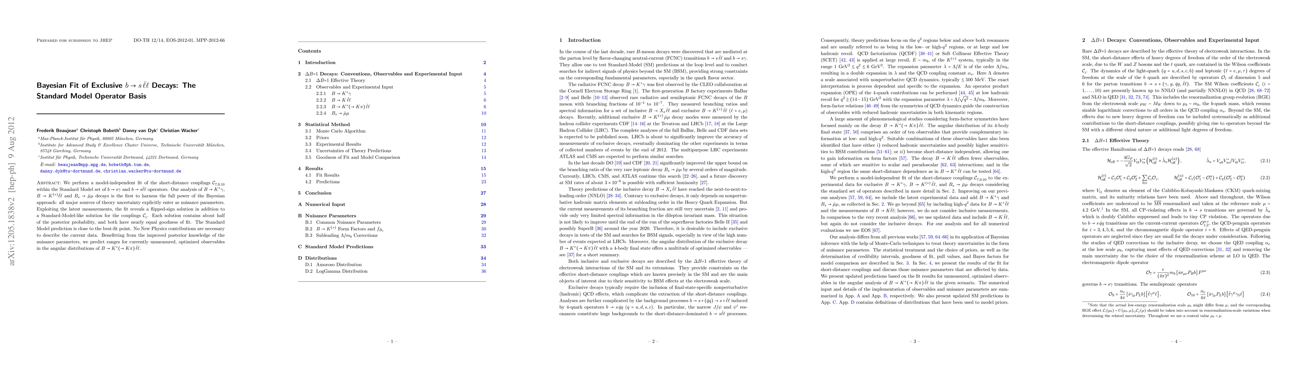 This paper conducts a Bayesian analysis of short-distance couplings in $b \to s \bar\ell\ell$ decays within the Standard Model, revealing two nearly equally probable solutions: a Standard-Model-like solution and a flipped-sign solution. No new physics is required to explain current data.