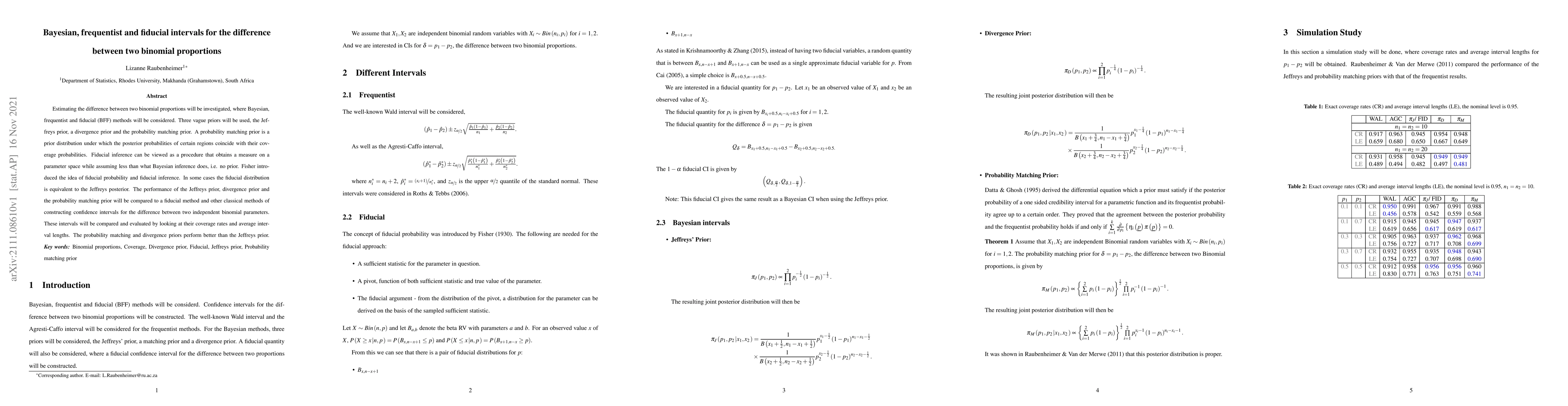 Estimating the difference between two binomial proportions will be investigated, where Bayesian, frequentist and fiducial (BFF) methods will be considered. Three vague priors will be used, the Jeffreys prior, a divergence prior and the probability matching prior. A probability matching prior is a prior distribution under which the posterior probabilities of certain regions coincide with their coverage probabilities. Fiducial inference can be viewed as a procedure that obtains a measure on a parameter space while assuming less than what Bayesian inference does, i.e. no prior. Fisher introduced the idea of fiducial probability and fiducial inference. In some cases the fiducial distribution is equivalent to the Jeffreys posterior. The performance of the Jeffreys prior, divergence prior and the probability matching prior will be compared to a fiducial method and other classical methods of constructing confidence intervals for the difference between two independent binomial parameters. These intervals will be compared and evaluated by looking at their coverage rates and average interval lengths. The probability matching and divergence priors perform better than the Jeffreys prior.