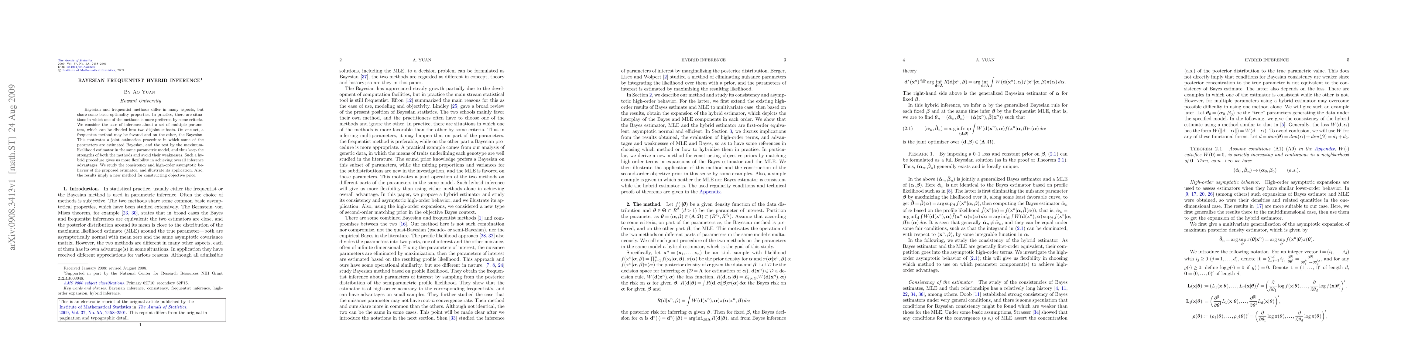 This paper proposes a hybrid inference method combining Bayesian and frequentist techniques for estimating multiple parameters divided into two subsets, where each method is preferred for different subsets. The study examines the consistency and asymptotic behavior of the hybrid estimator, demonstrating its flexibility and potential for constructing objective priors.