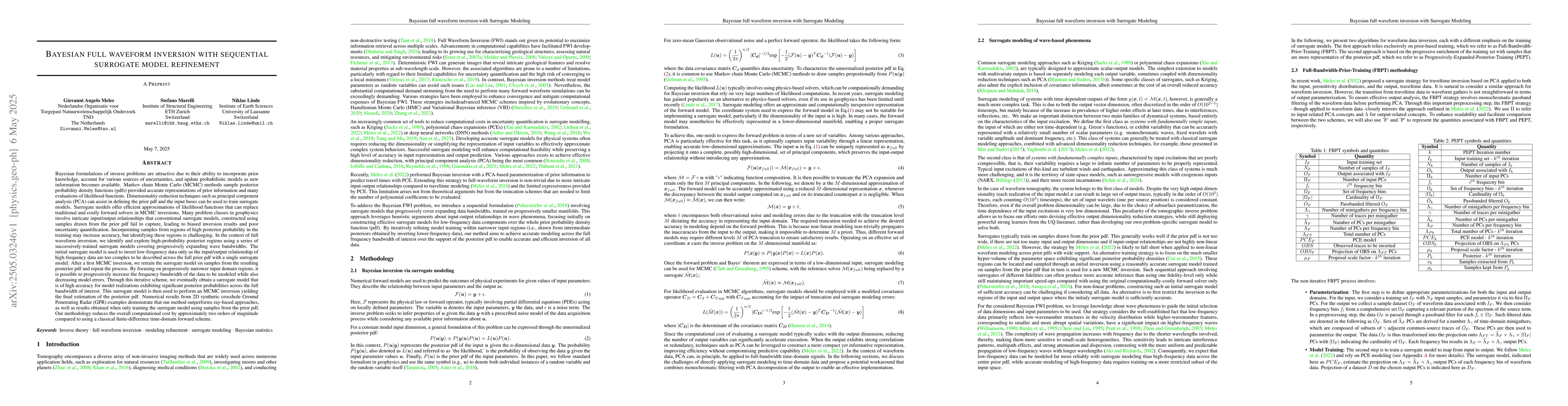 This paper proposes a Bayesian full waveform inversion method that iteratively refines a surrogate model using posterior samples, starting with low-frequency data and expanding to higher frequencies. The approach significantly reduces computational costs while outperforming traditional inversion methods in accuracy.