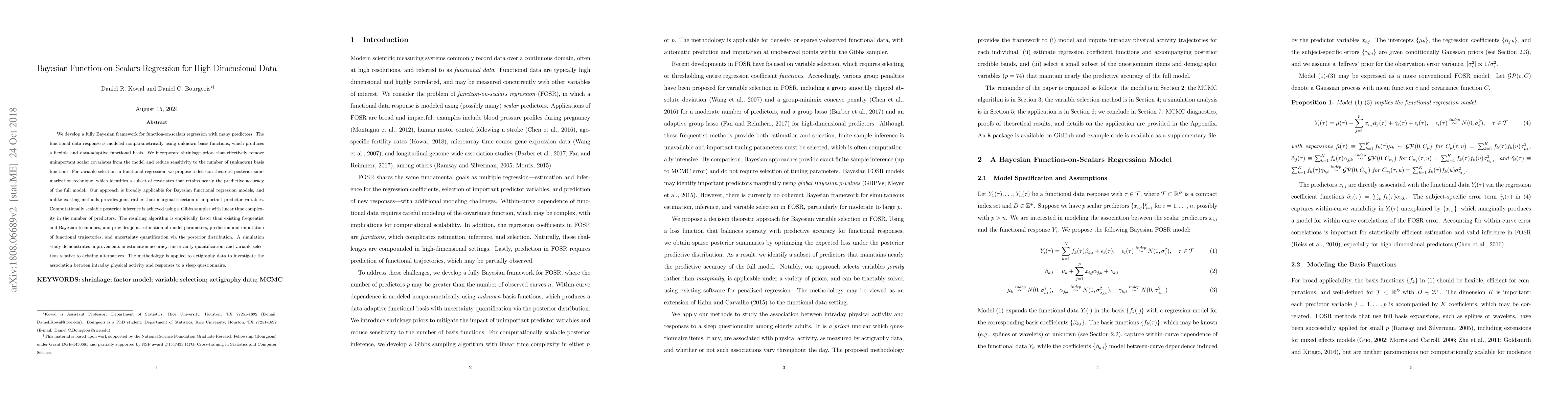 We develop a fully Bayesian framework for function-on-scalars regression with many predictors. The functional data response is modeled nonparametrically using unknown basis functions, which produces a flexible and data-adaptive functional basis. We incorporate shrinkage priors that effectively remove unimportant scalar covariates from the model and reduce sensitivity to the number of (unknown) basis functions. For variable selection in functional regression, we propose a decision theoretic posterior summarization technique, which identifies a subset of covariates that retains nearly the predictive accuracy of the full model. Our approach is broadly applicable for Bayesian functional regression models, and unlike existing methods provides joint rather than marginal selection of important predictor variables. Computationally scalable posterior inference is achieved using a Gibbs sampler with linear time complexity in the number of predictors. The resulting algorithm is empirically faster than existing frequentist and Bayesian techniques, and provides joint estimation of model parameters, prediction and imputation of functional trajectories, and uncertainty quantification via the posterior distribution. A simulation study demonstrates improvements in estimation accuracy, uncertainty quantification, and variable selection relative to existing alternatives. The methodology is applied to actigraphy data to investigate the association between intraday physical activity and responses to a sleep questionnaire.