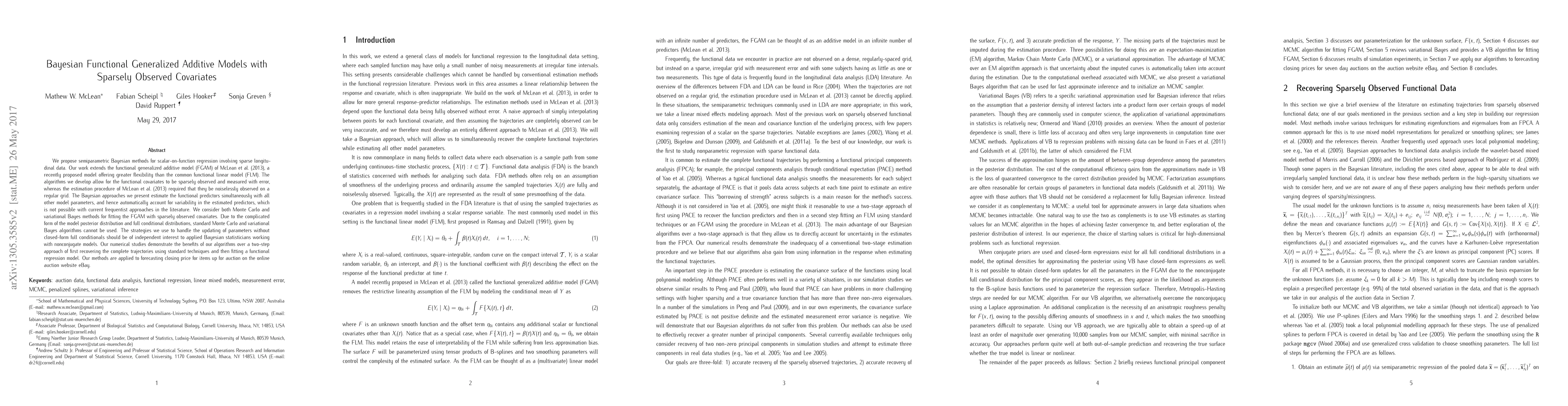 This paper develops a Bayesian version of the functional generalized additive model (FGAM) to handle Gaussian errors and identity link functions, allowing for sparsely observed and noisy functional covariates. It introduces novel Monte Carlo and variational Bayes methods to fit the model, demonstrating improved performance over traditional two-step approaches through real-world auction data analysis.