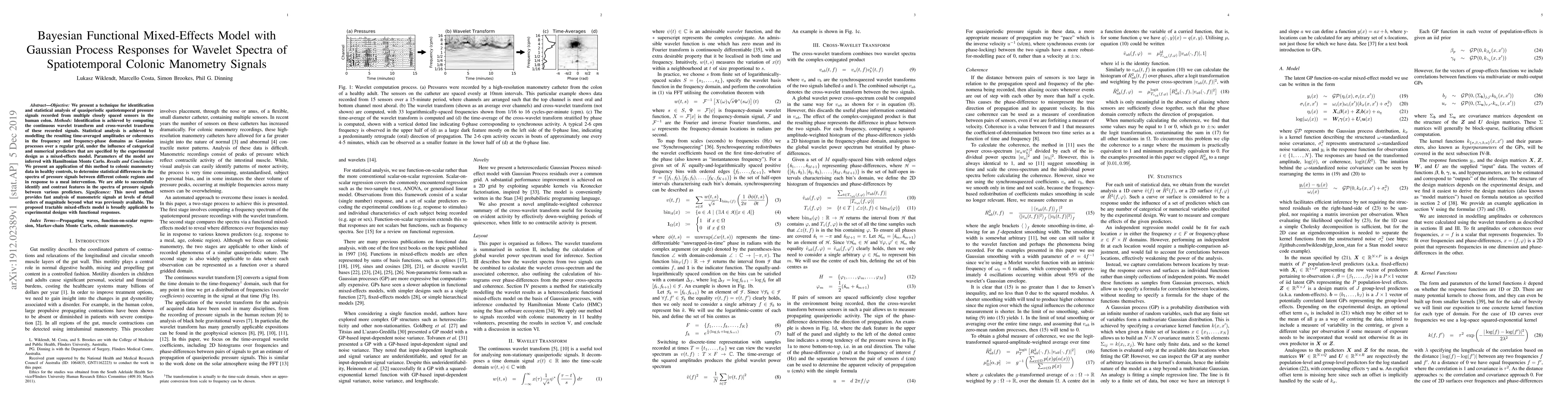 Objective: We present a technique for identification and statistical analysis of quasiperiodic spatiotemporal pressure signals recorded from multiple closely spaced sensors in the human colon. Methods: Identification is achieved by computing the continuous wavelet transform and cross-wavelet transform of these recorded signals. Statistical analysis is achieved by modelling the resulting time-averaged amplitudes or coherences in the frequency and frequency-phase domains as Gaussian processes over a regular grid, under the influence of categorical and numerical predictors that are specified by the experimental design as a mixed-effects model. Parameters of the model are inferred with Hamiltonian Monte Carlo. Results and Conclusion: We present an application of this method to colonic manometry data in healthy controls, to determine statistical differences in the spectra of pressure signals between different colonic regions and in response to a meal intervention. We are able to successfully identify and contrast features in the spectra of pressure signals between various predictors. Significance: This novel method provides fast analysis of manometric signals at levels of detail orders of magnitude beyond what was previously available. The proposed tractable mixed-effects model is broadly applicable to experimental designs with functional responses.
