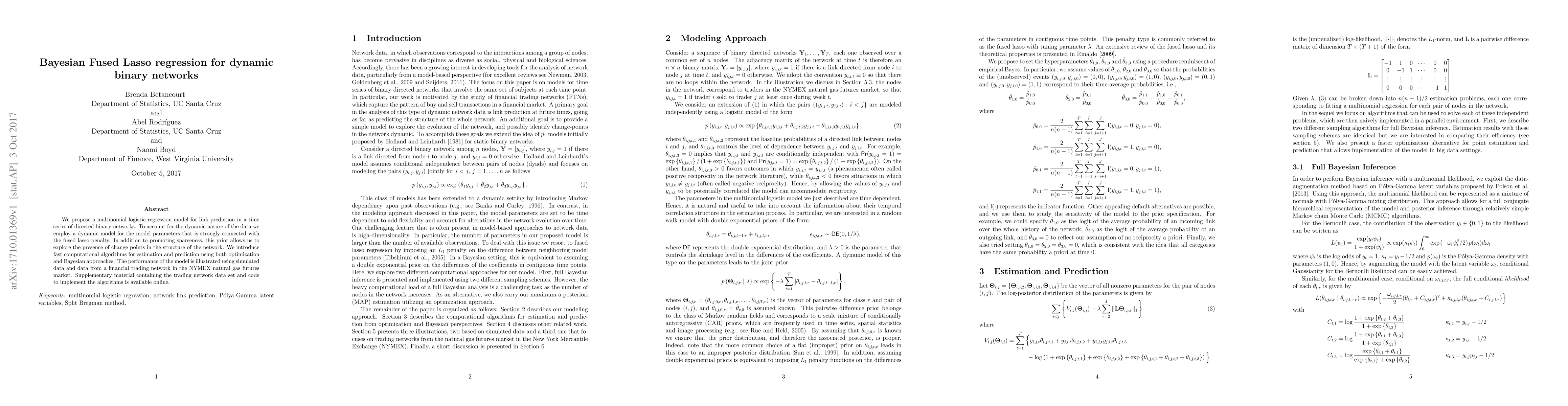 This paper proposes a Bayesian Fused Lasso regression model for predicting links in dynamic binary networks, incorporating change points and employing efficient computational algorithms. The model's performance is demonstrated through simulations and analysis of a financial trading network.