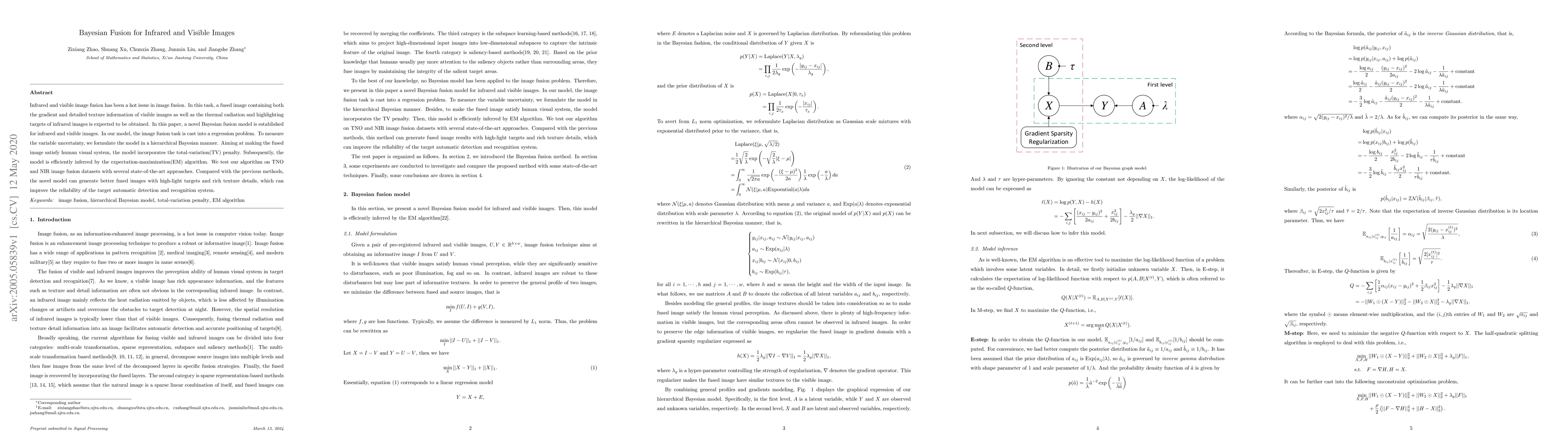 This paper proposes a Bayesian fusion model for combining infrared and visible images to produce a fused image that retains gradient and texture details from visible images and thermal radiation highlights from infrared images. The model uses a hierarchical Bayesian approach and total-variation penalty to ensure visual fidelity, and it is efficiently inferred using the expectation-maximization algorithm, outperforming previous methods in generating detailed and target-highlighted fused images.