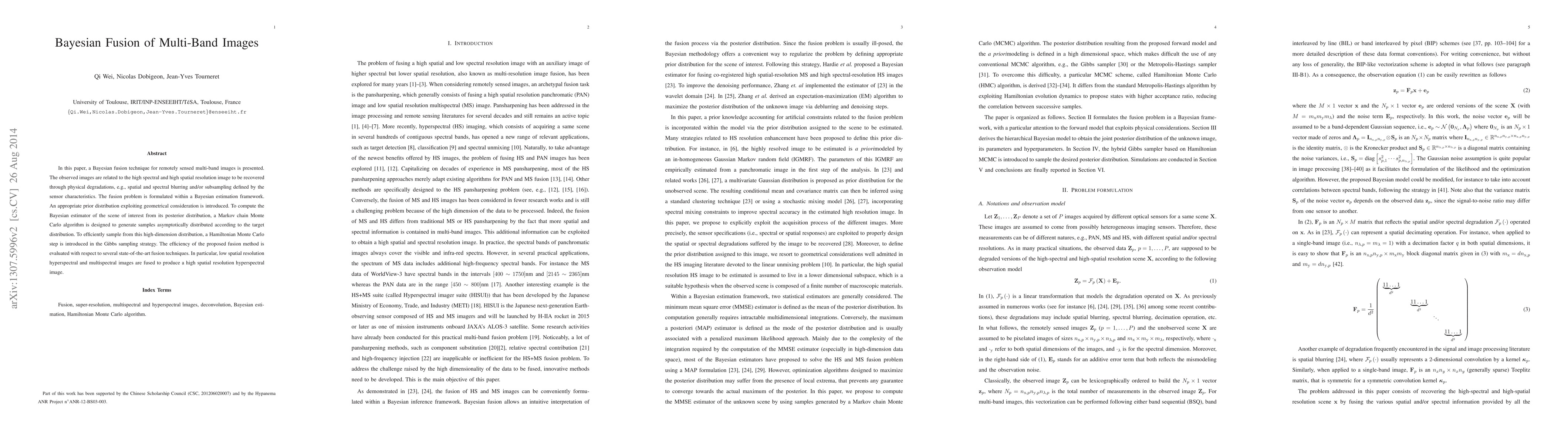 This paper proposes a Bayesian fusion technique for multi-band remotely sensed images, utilizing a Markov chain Monte Carlo algorithm with Hamiltonian Monte Carlo to efficiently estimate the high-resolution image from degraded inputs. The method is evaluated against state-of-the-art techniques, demonstrating its effectiveness in fusing low-resolution hyperspectral and multispectral images.