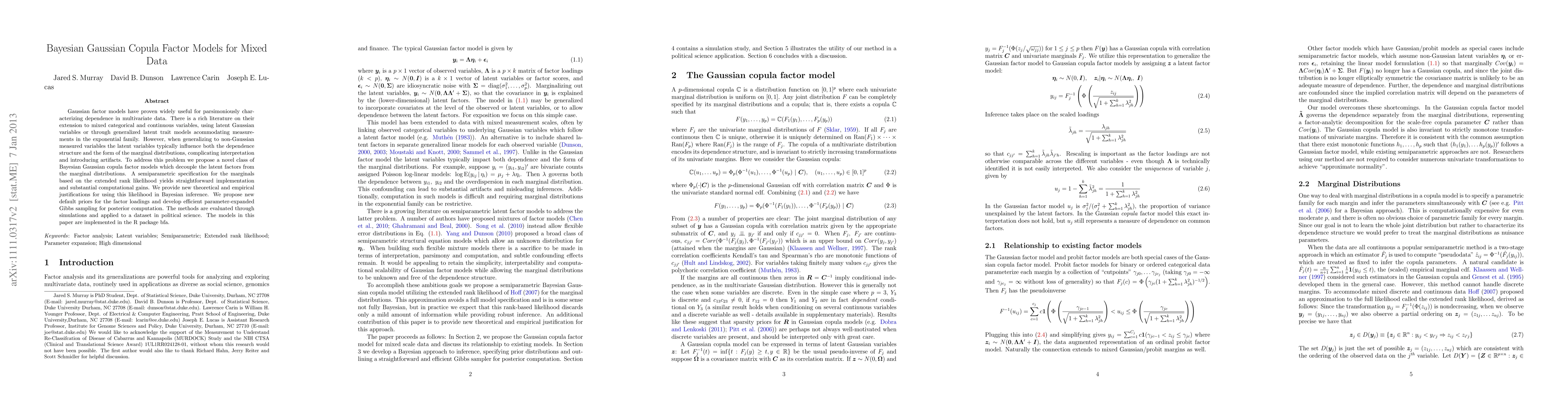 The paper proposes Bayesian Gaussian Copula Factor Models for mixed data, decoupling latent factors from marginal distributions for straightforward implementation and computational gains. It introduces new default priors for factor loadings and develops efficient parameter-expanded Gibbs sampling for posterior computation.