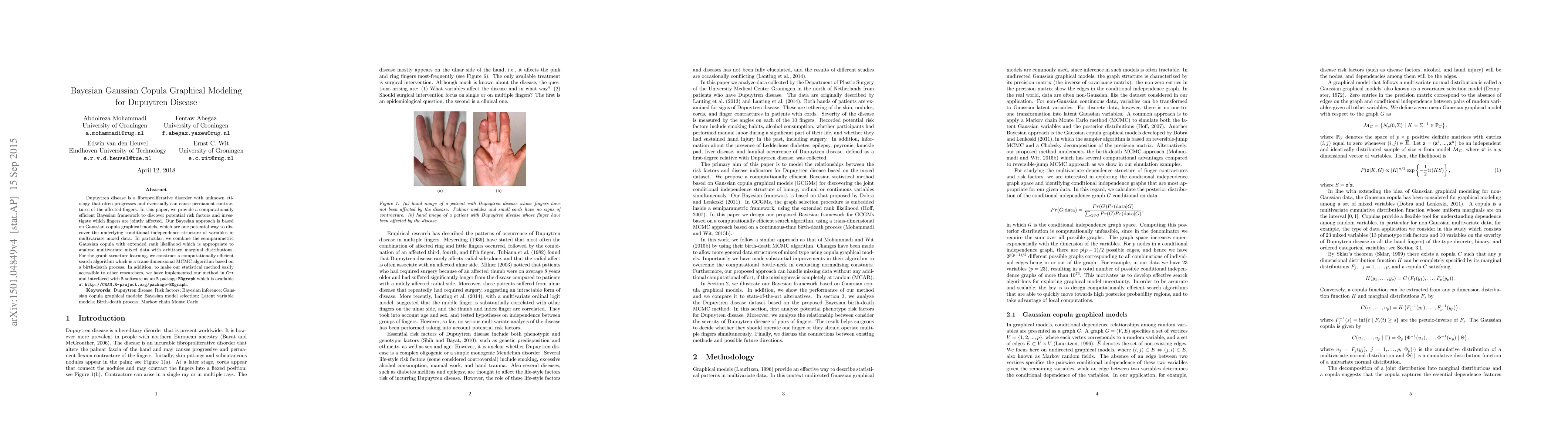 This paper introduces a Bayesian framework using Gaussian copula graphical models to identify risk factors and the joint effects of fingers in Dupuytren disease. The proposed method employs a computationally efficient trans-dimensional MCMC algorithm and is implemented in an R package, BDgraph, for easy access to researchers.