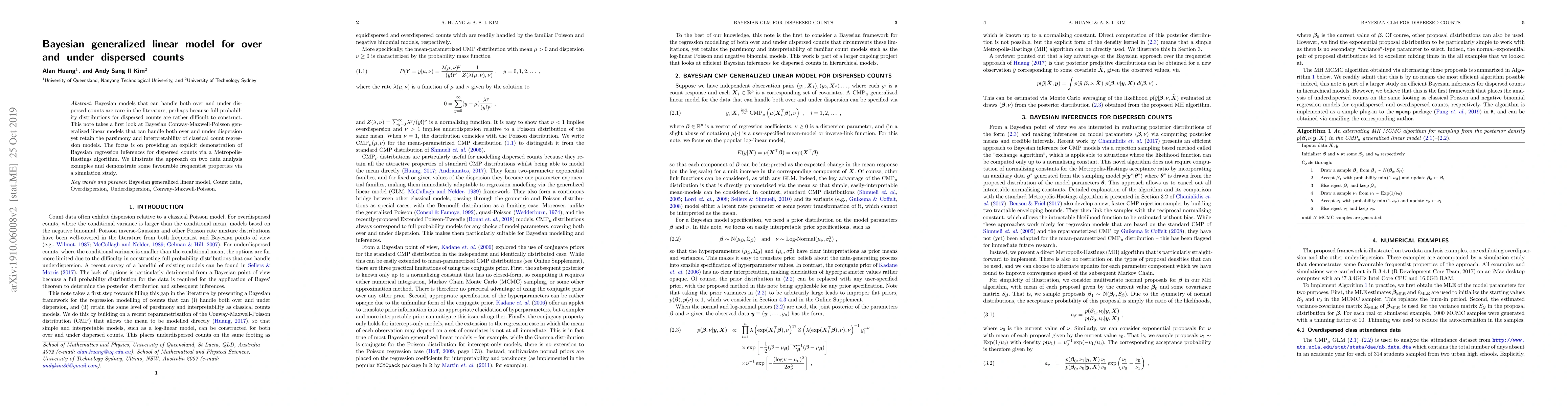 Bayesian models that can handle both over and under dispersed counts are rare in the literature, perhaps because full probability distributions for dispersed counts are rather difficult to construct. This note takes a first look at Bayesian Conway-Maxwell-Poisson generalized linear models that can handle both over and under dispersion yet retain the parsimony and interpretability of classical count regression models. The focus is on providing an explicit demonstration of Bayesian regression inferences for dispersed counts via a Metropolis-Hastings algorithm. We illustrate the approach on two data analysis examples and demonstrate some favourable frequentist properties via a simulation study.