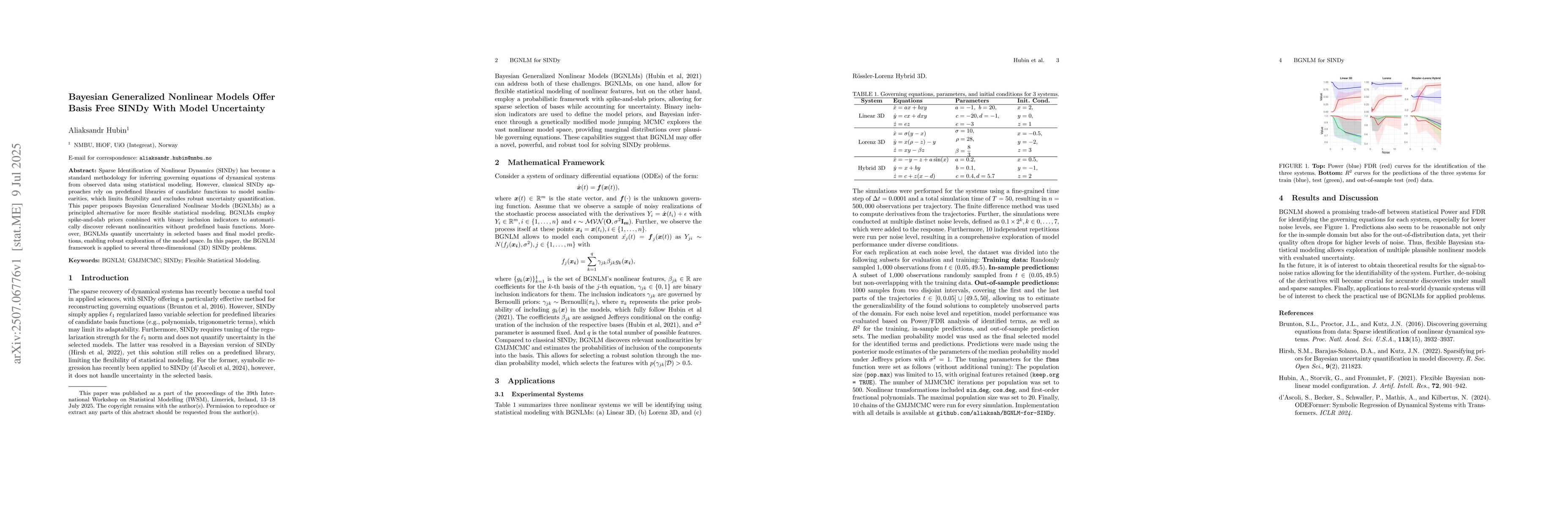 Sparse Identification of Nonlinear Dynamics (SINDy) has become a standard methodology for inferring governing equations of dynamical systems from observed data using statistical modeling. However, classical SINDy approaches rely on predefined libraries of candidate functions to model nonlinearities, which limits flexibility and excludes robust uncertainty quantification. This paper proposes Bayesian Generalized Nonlinear Models (BGNLMs) as a principled alternative for more flexible statistical modeling. BGNLMs employ spike-and-slab priors combined with binary inclusion indicators to automatically discover relevant nonlinearities without predefined basis functions. Moreover, BGNLMs quantify uncertainty in selected bases and final model predictions, enabling robust exploration of the model space. In this paper, the BGNLM framework is applied to several three-dimensional (3D) SINDy problems.