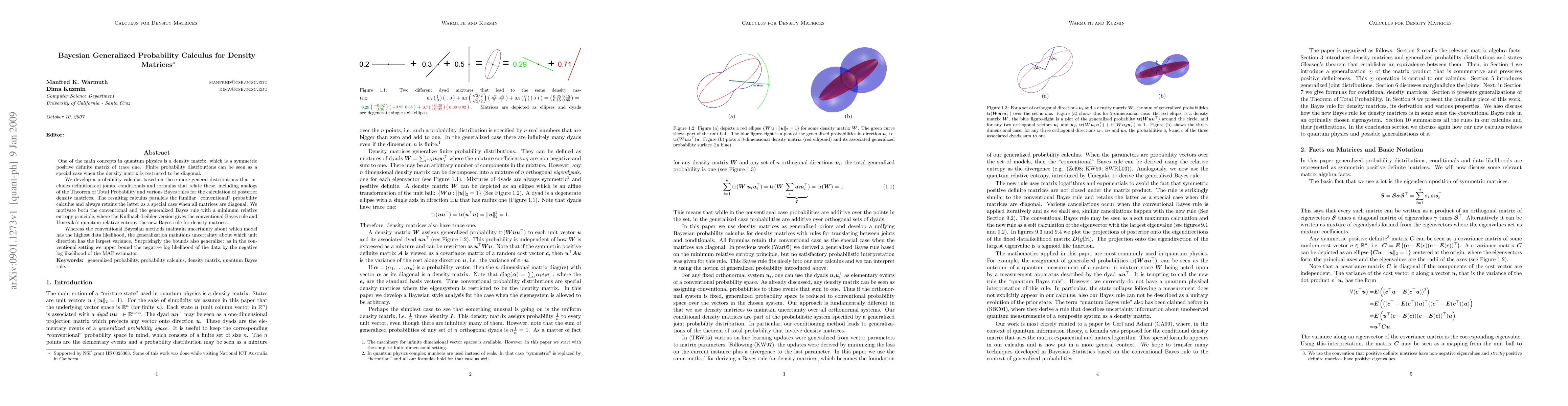 One of the main concepts in quantum physics is a density matrix, which is a symmetric positive definite matrix of trace one. Finite probability distributions can be seen as a special case when the density matrix is restricted to be diagonal. We develop a probability calculus based on these more general distributions that includes definitions of joints, conditionals and formulas that relate these, including analogs of the Theorem of Total Probability and various Bayes rules for the calculation of posterior density matrices. The resulting calculus parallels the familiar "conventional" probability calculus and always retains the latter as a special case when all matrices are diagonal. We motivate both the conventional and the generalized Bayes rule with a minimum relative entropy principle, where the Kullbach-Leibler version gives the conventional Bayes rule and Umegaki's quantum relative entropy the new Bayes rule for density matrices. Whereas the conventional Bayesian methods maintain uncertainty about which model has the highest data likelihood, the generalization maintains uncertainty about which unit direction has the largest variance. Surprisingly the bounds also generalize: as in the conventional setting we upper bound the negative log likelihood of the data by the negative log likelihood of the MAP estimator.