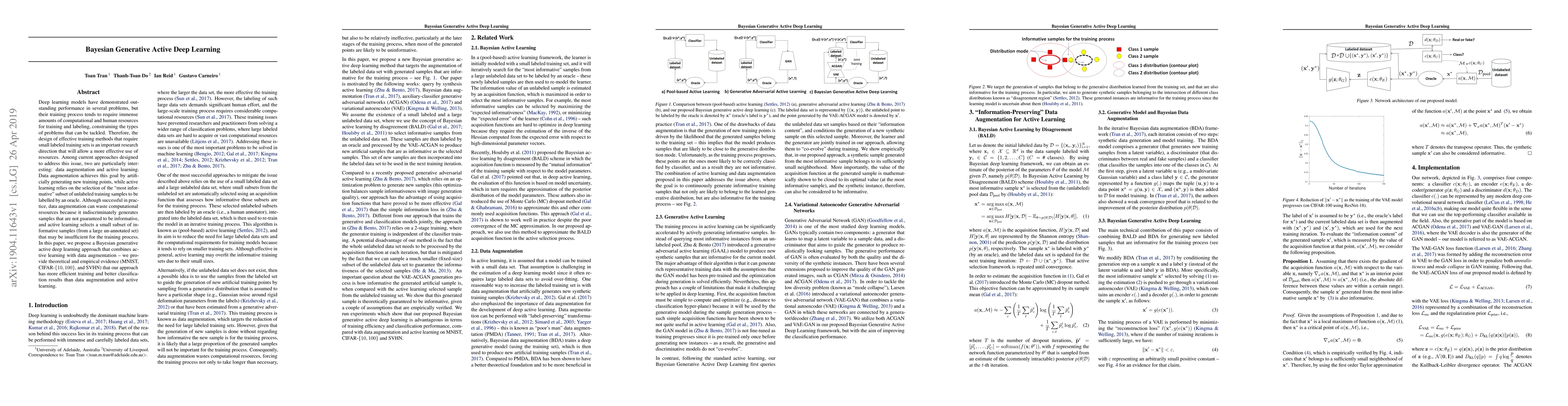 Deep learning models have demonstrated outstanding performance in several problems, but their training process tends to require immense amounts of computational and human resources for training and labeling, constraining the types of problems that can be tackled. Therefore, the design of effective training methods that require small labeled training sets is an important research direction that will allow a more effective use of resources.Among current approaches designed to address this issue, two are particularly interesting: data augmentation and active learning. Data augmentation achieves this goal by artificially generating new training points, while active learning relies on the selection of the "most informative" subset of unlabeled training samples to be labelled by an oracle. Although successful in practice, data augmentation can waste computational resources because it indiscriminately generates samples that are not guaranteed to be informative, and active learning selects a small subset of informative samples (from a large un-annotated set) that may be insufficient for the training process. In this paper, we propose a Bayesian generative active deep learning approach that combines active learning with data augmentation -- we provide theoretical and empirical evidence (MNIST, CIFAR-$\{10,100\}$, and SVHN) that our approach has more efficient training and better classification results than data augmentation and active learning.