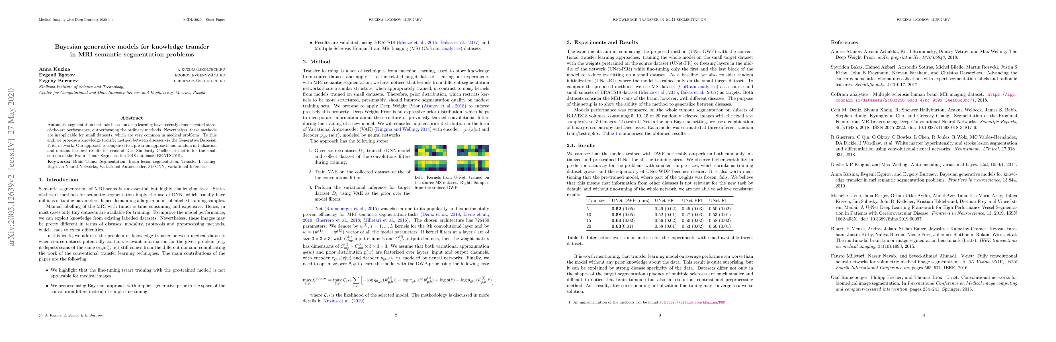 Automatic segmentation methods based on deep learning have recently demonstrated state-of-the-art performance, outperforming the ordinary methods. Nevertheless, these methods are inapplicable for small datasets, which are very common in medical problems. To this end, we propose a knowledge transfer method between diseases via the Generative Bayesian Prior network. Our approach is compared to a pre-train approach and random initialization and obtains the best results in terms of Dice Similarity Coefficient metric for the small subsets of the Brain Tumor Segmentation 2018 database (BRATS2018).