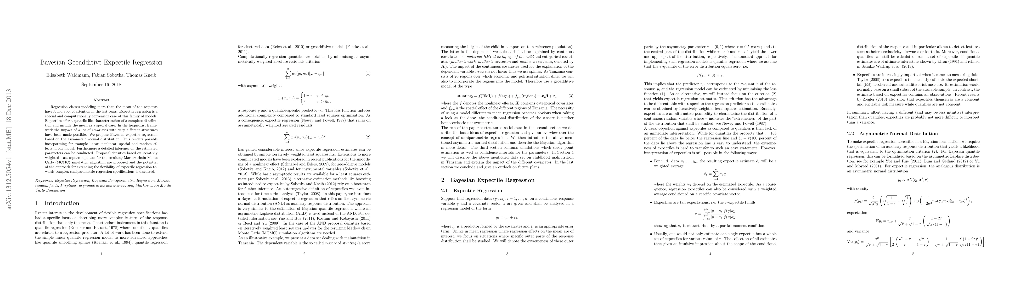 This paper proposes a Bayesian geoadditive expectile regression model based on the asymmetric normal distribution, allowing for the incorporation of various effects like linear, nonlinear, spatial, and random effects. The method employs MCMC simulation with iteratively weighted least squares updates for parameter estimation, enhancing the flexibility of expectile regression for complex semiparametric specifications.