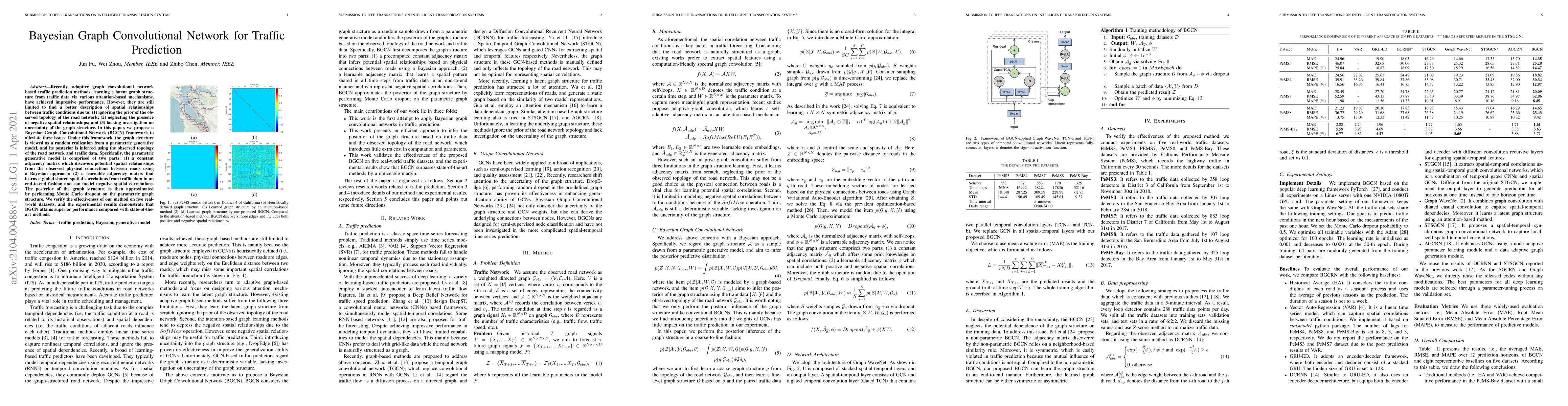 The paper proposes a Bayesian Graph Convolutional Network (BGCN) framework to improve traffic prediction by addressing limitations in existing adaptive graph convolutional methods. BGCN infers the graph structure from a generative model, incorporating both observed road network topology and traffic data to model spatial relationships and uncertainties, achieving superior performance on real-world datasets.